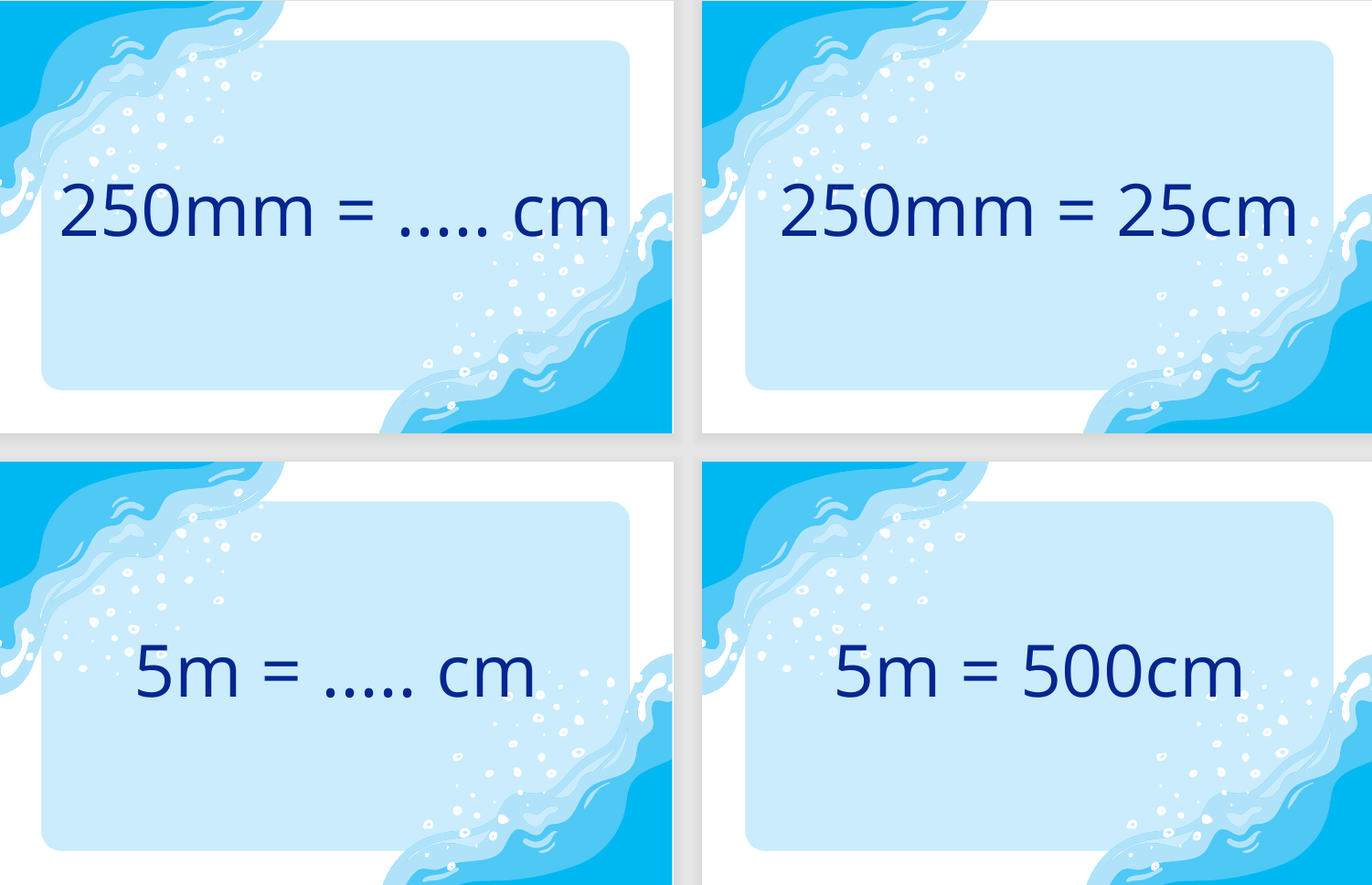 Każda fiszka zawiera zadanie z przeliczeniem jednostek (np. 2,5 m = ? cm) oraz poprawne rozwiązanie na odwrocie. Dzięki temu możesz sprawdzać wiedzę samodzielnie lub ćwiczyć w parach.