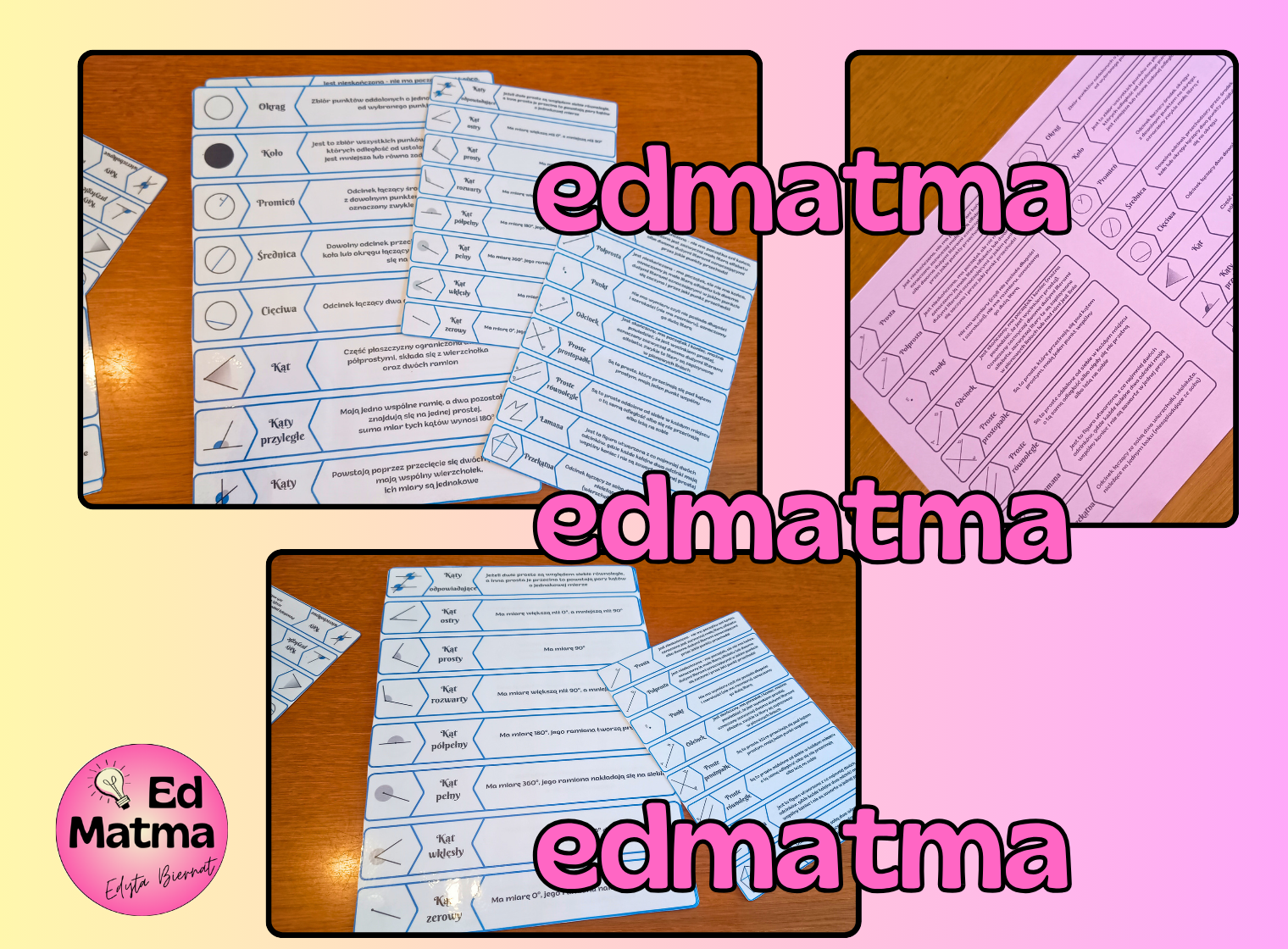 Zestaw zawiera 32 kluczowe pojęcia, m.in.: punkt, prosta, odcinek, łamana, okrąg, średnica, kąty przyległe i wiele innych. Każdy element układanki to logiczne połączenie trzech składowych:
