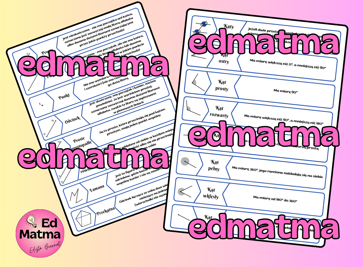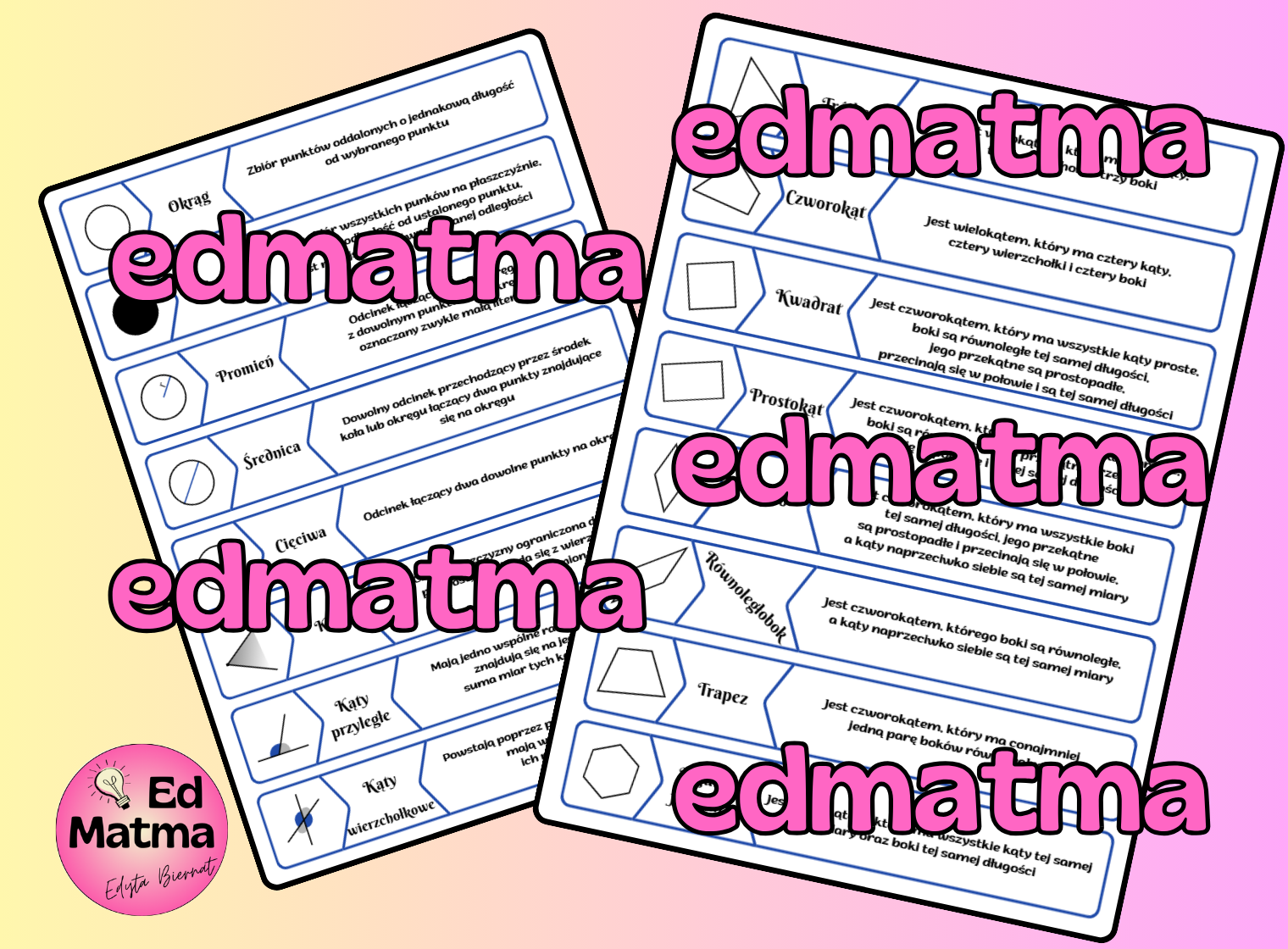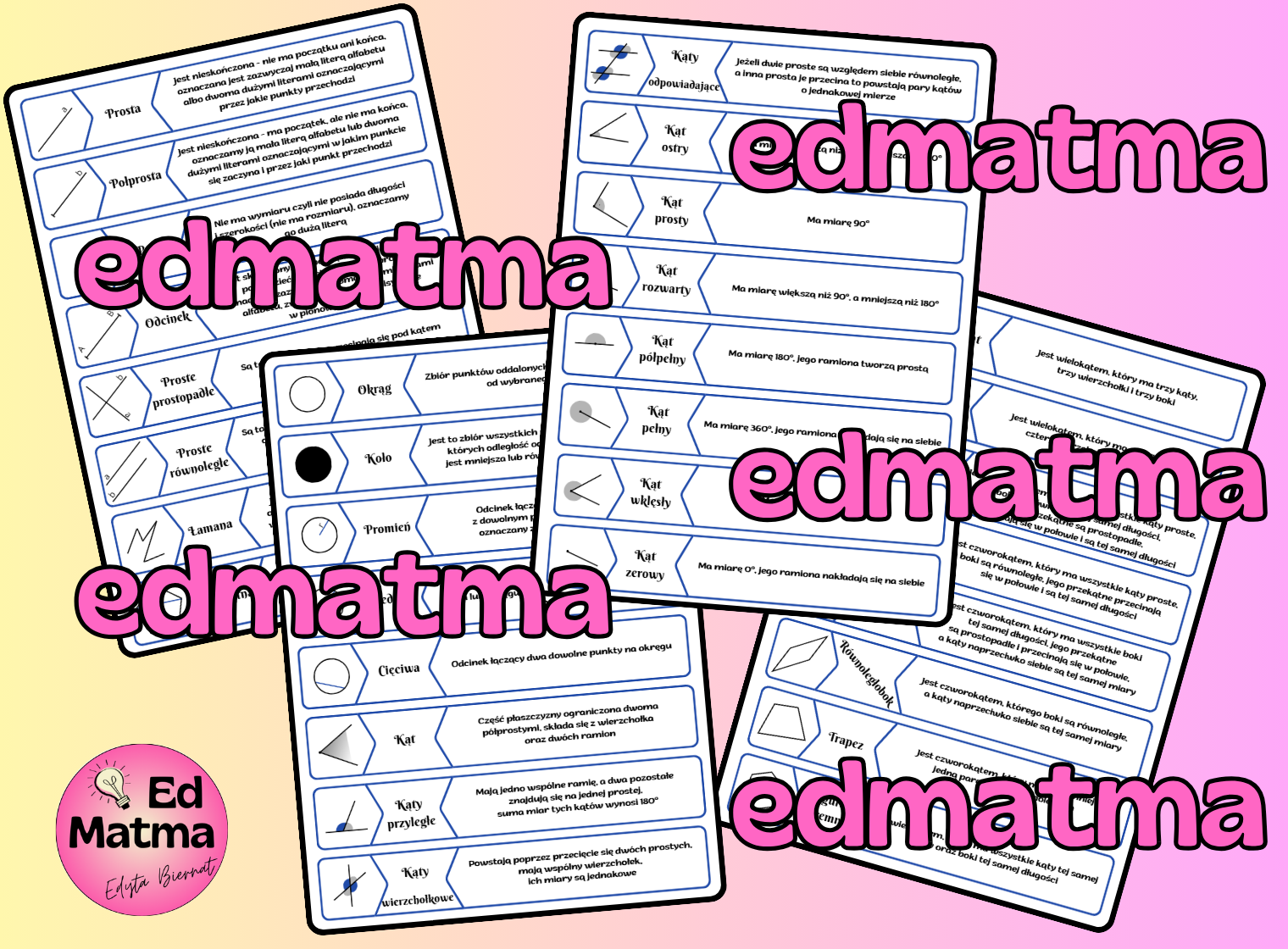 Ten materiał to kompleksowe zestawienie 32 najważniejszych definicji z zakresu geometrii płaskiej, przygotowane w formie przejrzystej tabeli na arkuszu A4 (aż 4 strony kompletnych difinicji). To idealne narzędzie dla nauczycieli, którzy chcą aktywizować swoich uczniów i ułatwić im zrozumienie trudnych pojęć.