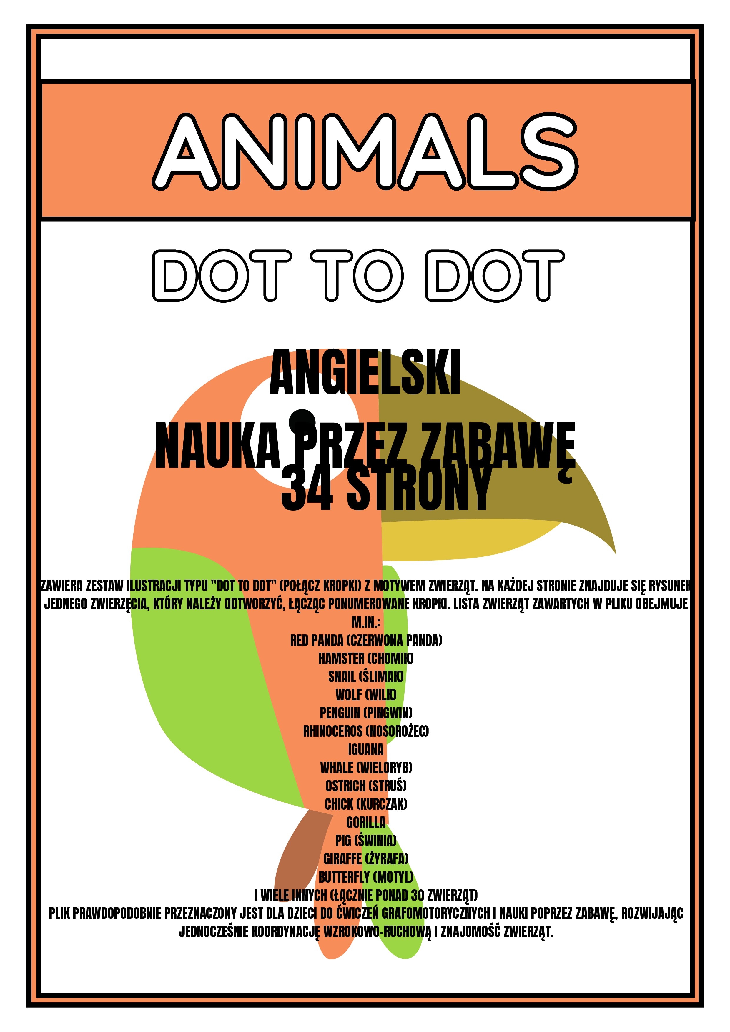 34 strony zawiera zestaw ilustracji typu "dot to dot" (połącz kropki) z motywem zwierząt. Na każdej stronie znajduje się rysunek jednego zwierzęcia, który należy odtworzyć, łącząc ponumerowane kropki. Lista zwierząt zawartych w pliku obejmuje m.in.:
