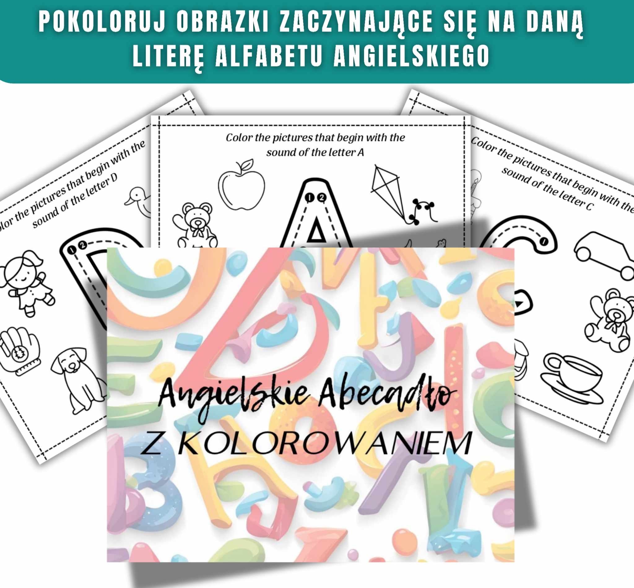 Karty pracy zawierające ćwiczenia dotyczące języka angielskiego i alfabetu.