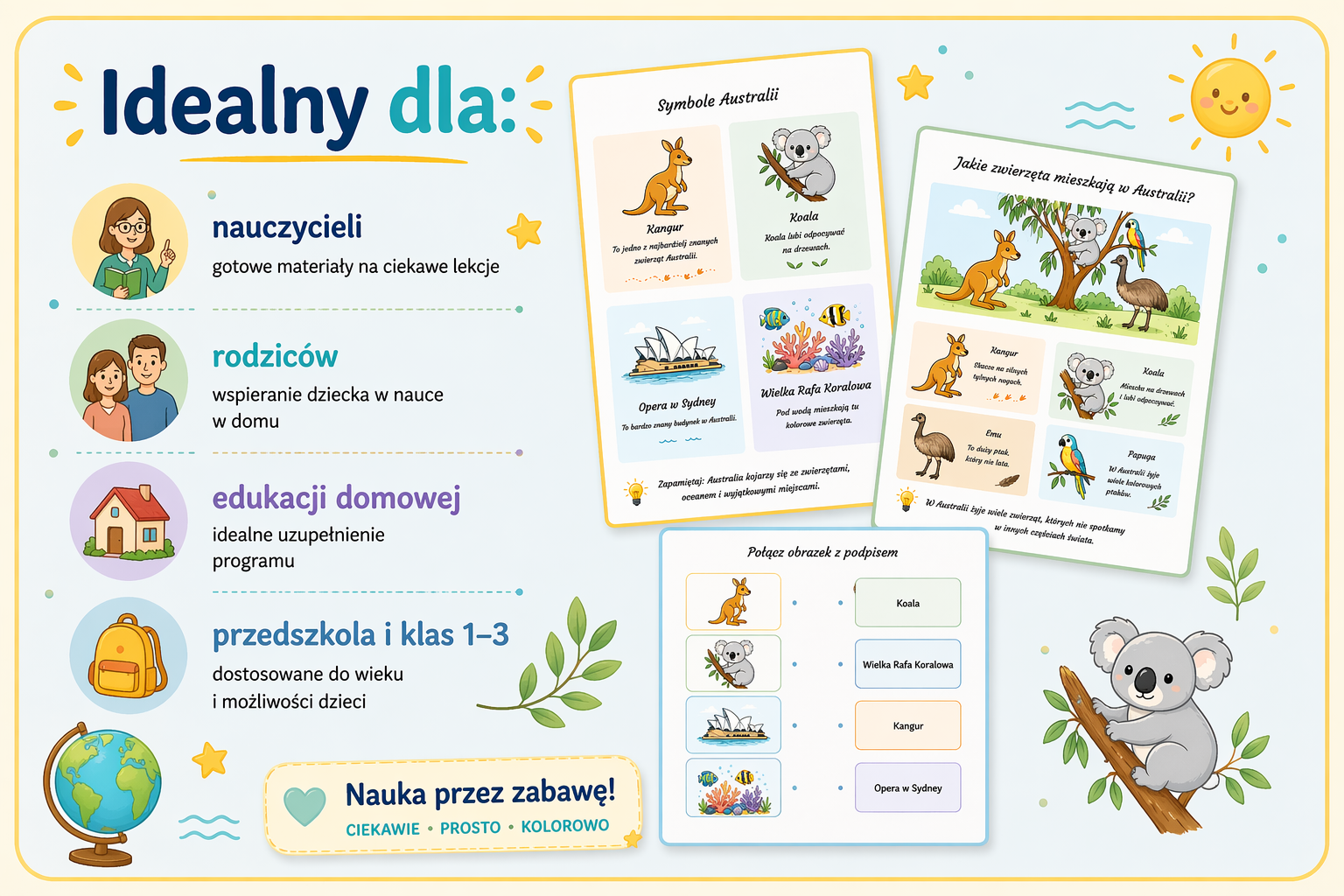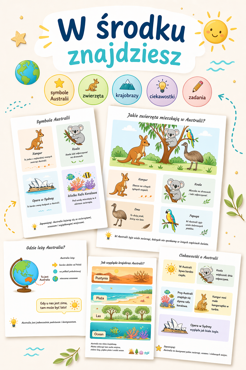 #Australia #Kontynenty #Edukacja #EdukacjaWczesnoszkolna #NaukaPrzezZabawę #MateriałyEdukacyjne #KartyPracy #GeografiaDlaDzieci #Przedszkole #SzkołaPodstawowa #Nauczyciel #PomocDydaktyczna #ZwierzętaAustralii #Koala #Kangur #WielkaRafaKoralowa #OperaWSydney #DzieciUcząSię #InspiracjeDlaNauczycieli #EdukacjaPrzyrodnicza