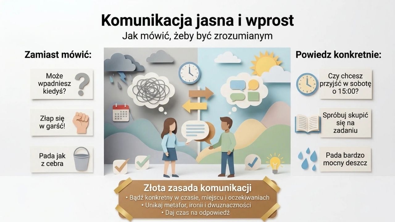 Z materiałem można pracować na kilka sposobów. Jako gazetka szkolna świetnie sprawdzi się na korytarzu, w sali, bibliotece lub przy gabinecie pedagoga. Jako prezentację warto omawiać go etapami: najpierw czym jest autyzm i jak osoby w spektrum mogą odbierać świat, potem komunikacja, sensoryka i rutyna, a na końcu praktyczne wskazówki, jak wspierać i jak być sojusznikiem. Bardzo dobrze działa też praca warsztatowa: po omówieniu plansz uczniowie mogą wspólnie stworzyć klasową listę zasad wspierającej komunikacji i zachowań, które pomagają budować bezpieczną, włączającą grupę.