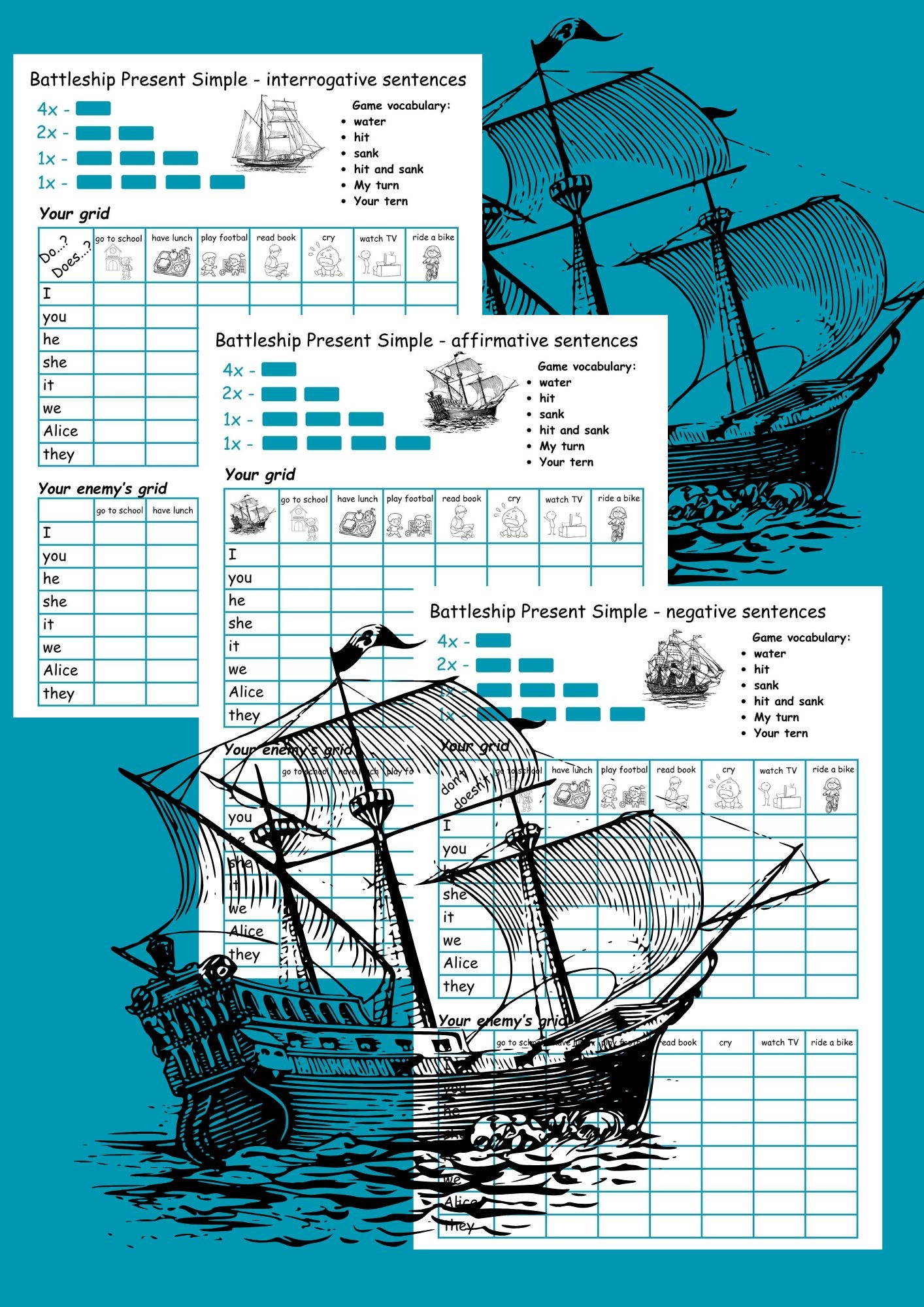 Co zawiera materiał? Plansze do gry typu „statki” (Battleship) Ćwiczenia obejmujące zdania twierdzące, przeczące i pytające w Present Simple Praktyczne słownictwo dnia codziennego (np. go to school, watch TV, ride a bike) Elementy interakcji: „My turn”, „Your turn”, „hit”, „miss”, „sank” 💡 Dlaczego warto? Uczniowie uczą się poprzez działanie i rywalizację Idealne do pracy w parach lub małych grupach Wspiera komunikację i naturalne użycie języka Pomaga utrwalić struktury gramatyczne w przyjemny sposób