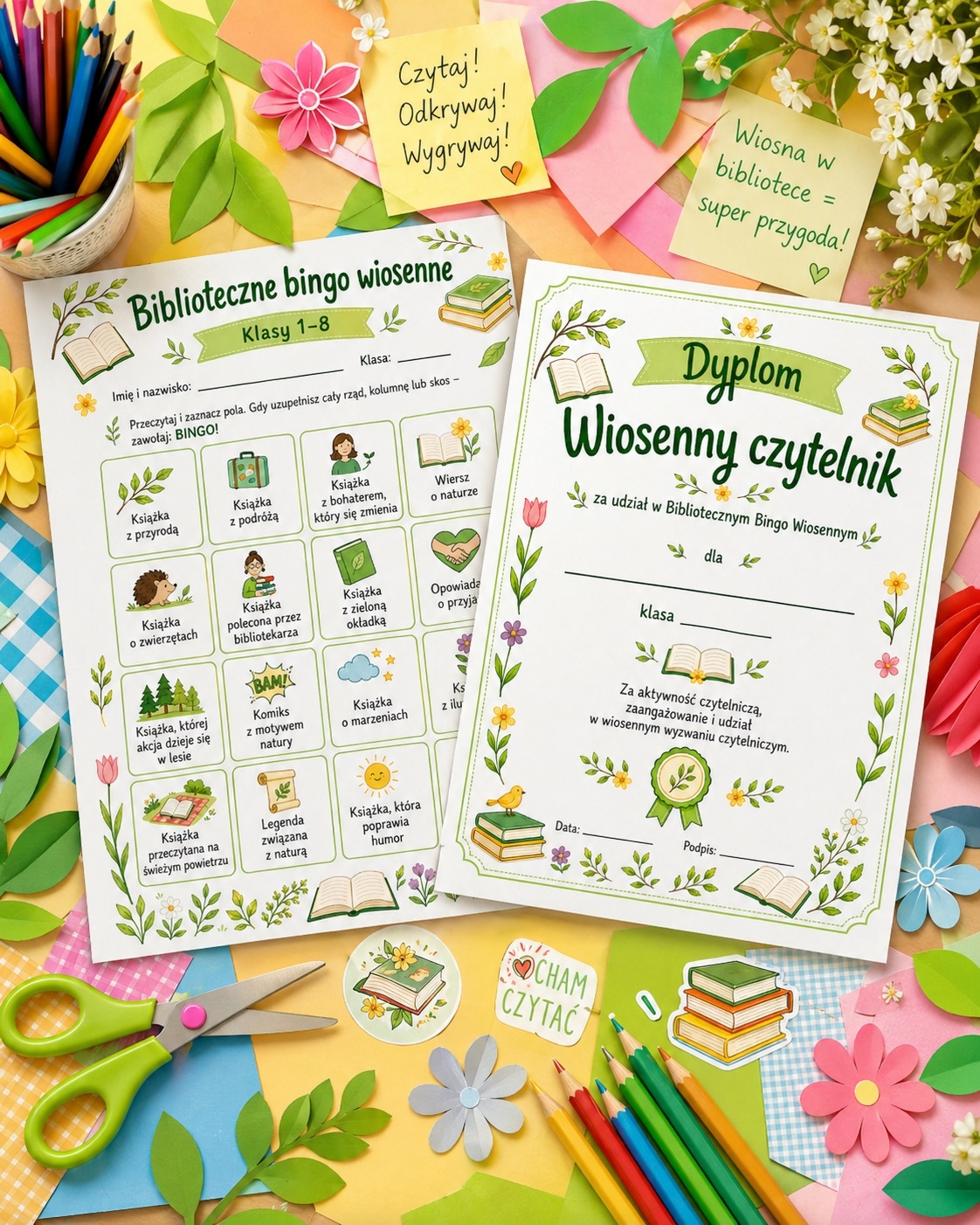 Materiał sprawdzi się podczas lekcji bibliotecznych, akcji promujących czytelnictwo, zajęć świetlicowych, obchodów Dnia Książki, Tygodnia Bibliotek albo jako wiosenne wyzwanie czytelnicze w klasie. 🌱