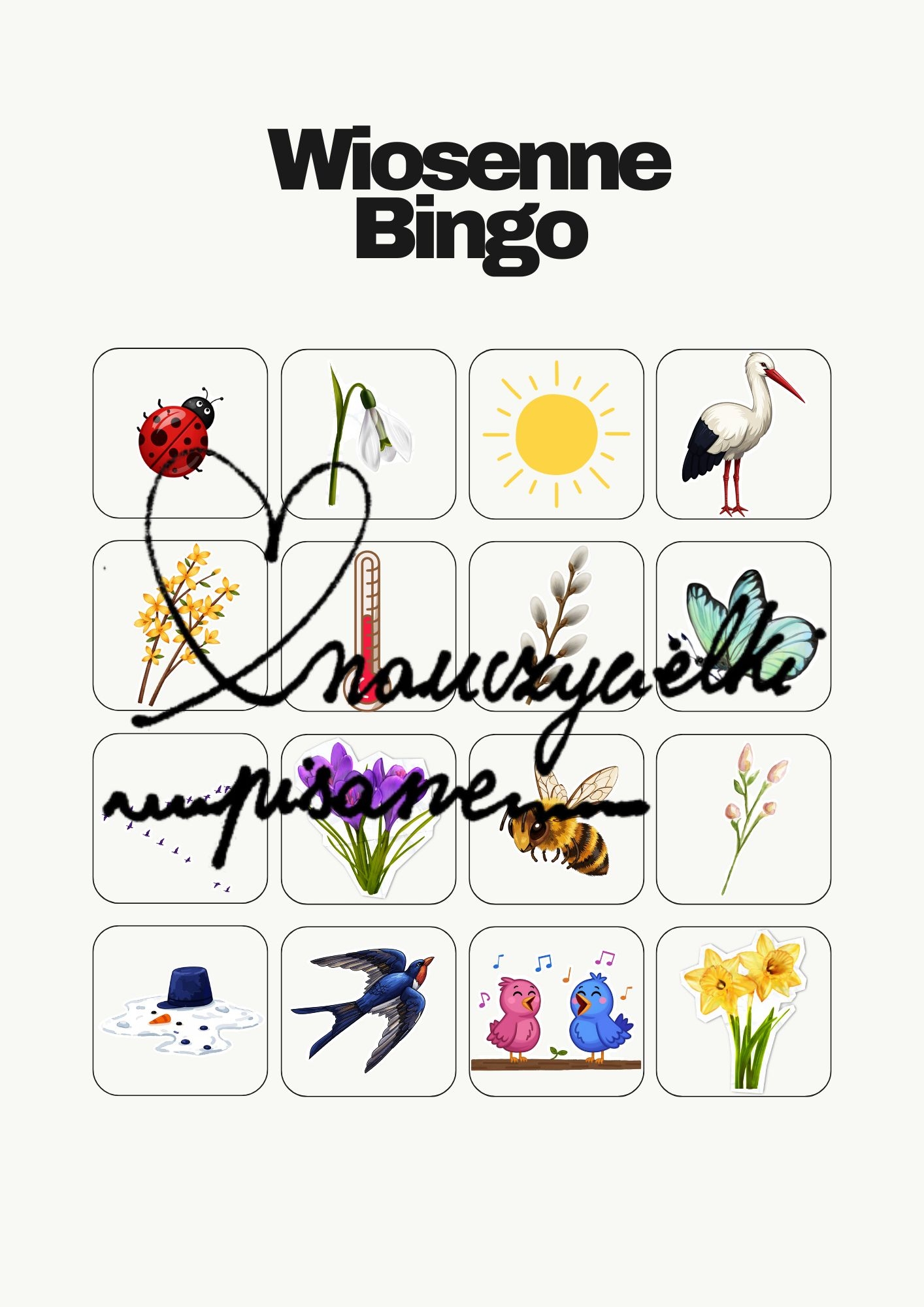 Bingo "Wiosenne zwiastuny", których można szukać podczas spaceru. W pakiecie znajdują się 4 strony różnie pomieszanych 16 zwiastunów wiosny. W razie wątpliwości, co oznaczają konkretne obrazki załączyłam legendę.