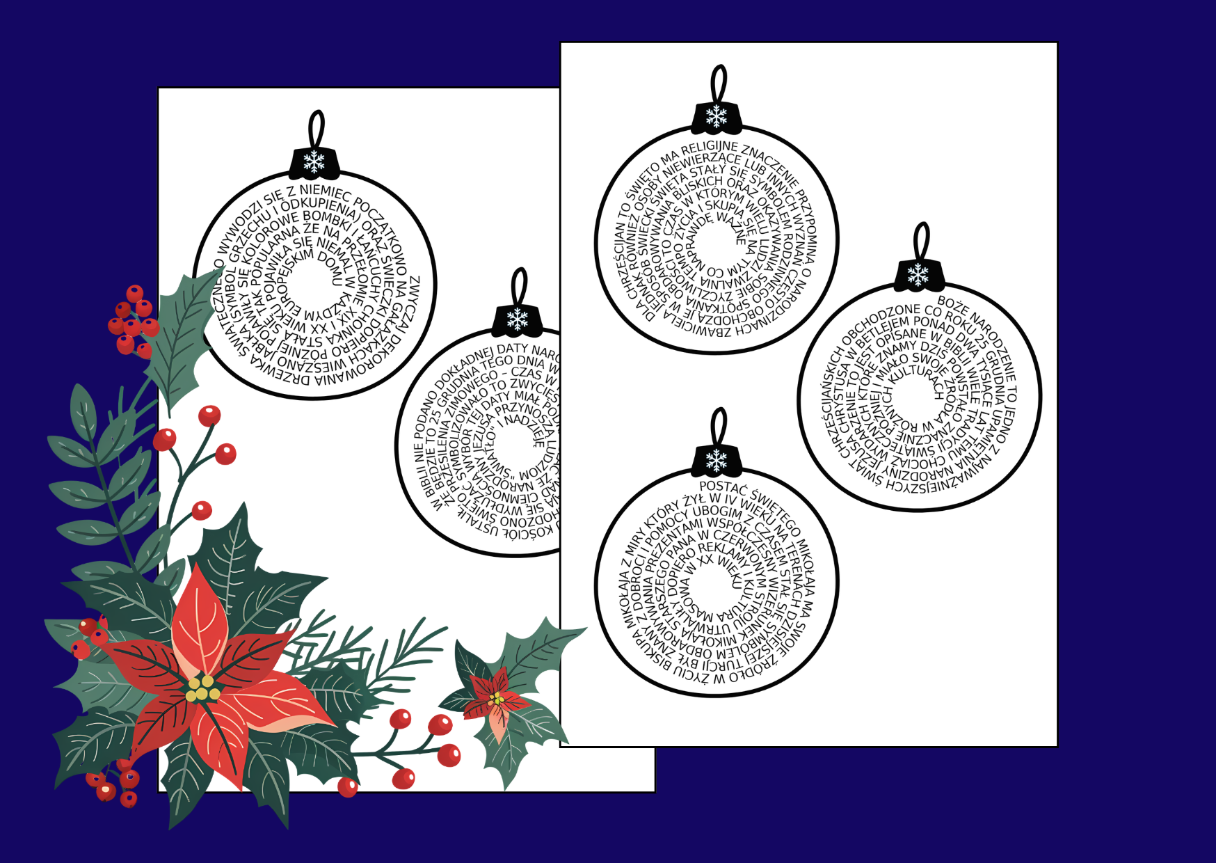 W pięciu świątecznych bombkach umieszczono krótkie teksty dotyczące Bożego Narodzenia, zapisane wielkimi literami i bez znaków interpunkcyjnych (dodałam także poprawne teksty).