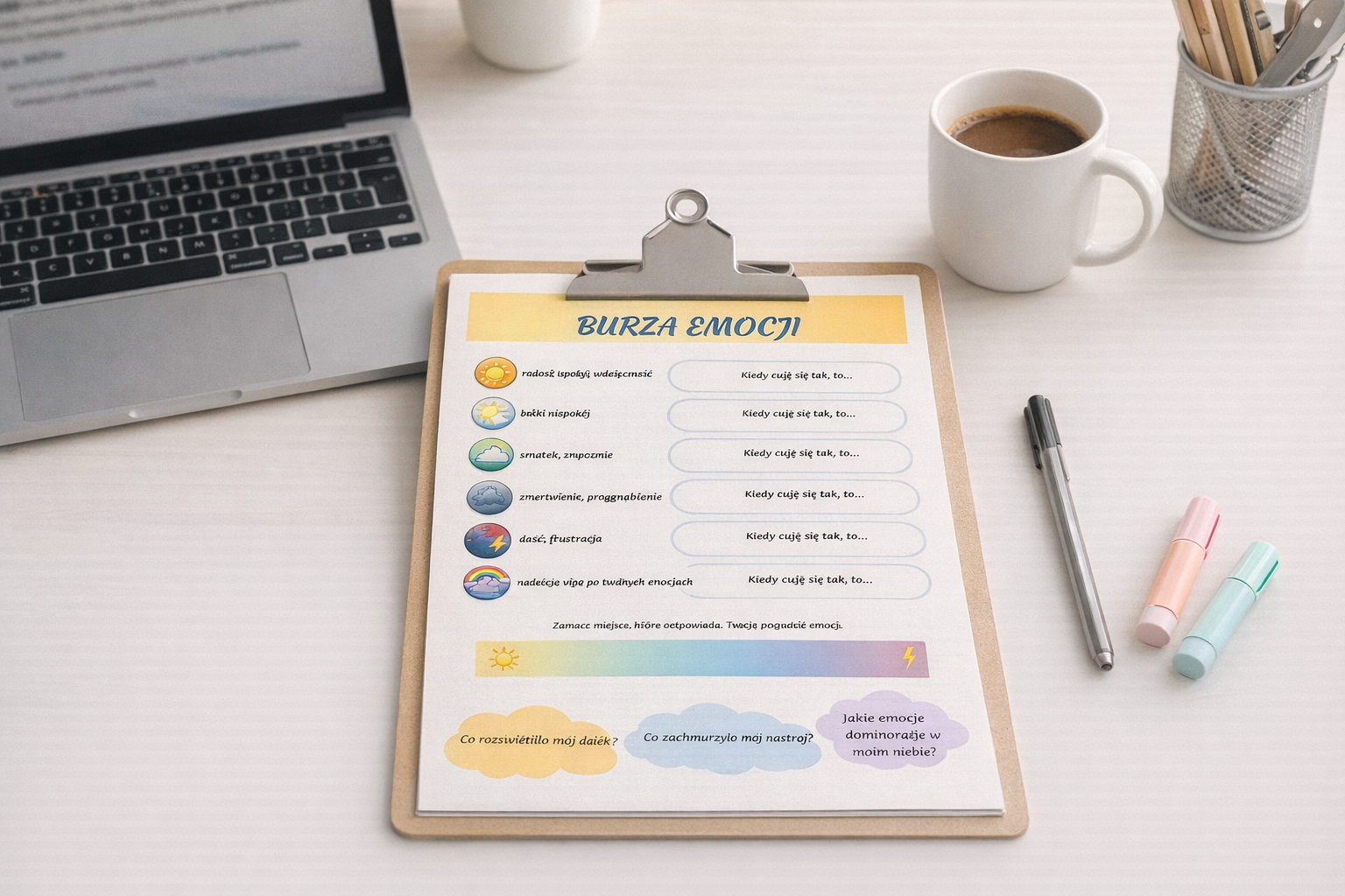 „Burza emocji” to 4-stronicowa karta samoświadomości emocjonalnej w formacie PDF, stworzona z myślą o nauczycielach, wychowawcach, psychologach szkolnych i rodzicach.