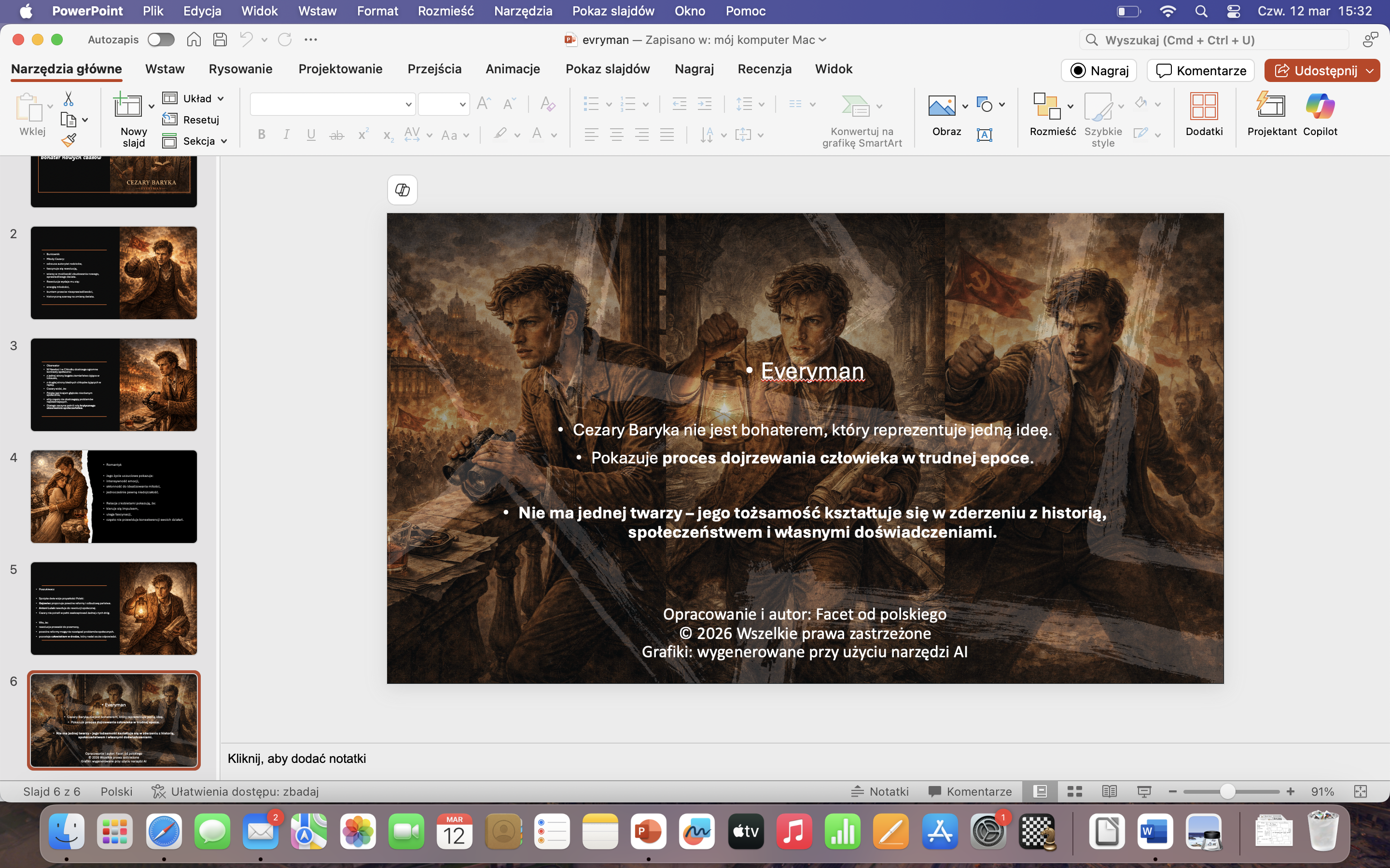 Prezentacja została przygotowana jako materiał dydaktyczny do pracy z powieścią Przedwiośnie autorstwa Stefan Żeromski. Jej celem jest pokazanie złożoności postaci Cezary Baryka oraz ukazanie bohatera jako reprezentanta młodego pokolenia wchodzącego w dorosłość w czasie gwałtownych przemian historycznych.