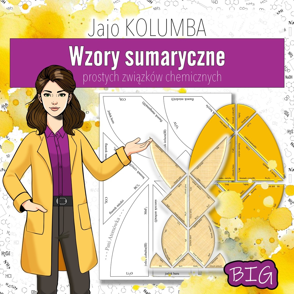 Jajeczny tangram utrwalający wzory i nazewnictwo prostych związków chemicznych. Idealnie nadaje się na ostatnie lekcje przed przerwą świąteczną.