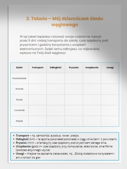 - Tabela do samodzielnego wypełniania, która pomaga monitorować codzienne zużycie (transport, prysznic, urządzenia elektroniczne).