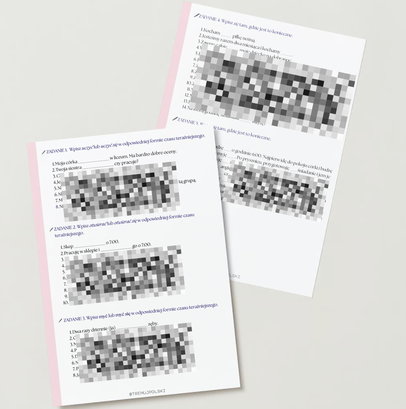 W e-booku znajdziesz bogaty zestaw ćwiczeń, które umożliwiają ćwiczenie zaimka zwrotnego „się” w kontekście codziennych sytuacji językowych. ❌ E-book nie zawiera wyjaśnień gramatycznych ani teoretycznych opisów – to narzędzie skupione wyłącznie na zadaniach.