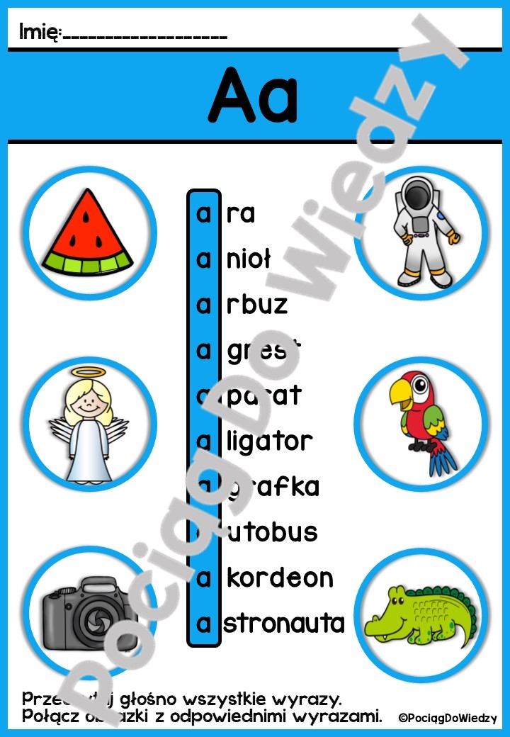 Karty pracy do nauki liter alfabetu oraz prawidłowego wymawiania dźwięków liter w wyrazach. Każda karta zawiera zestaw 10 wyrazów, o różnych poziomach trudności, zaczynających się na tę samą literę. Zadaniem ucznia jest głośne odczytanie wyrazów oraz połączenie 6 z nich ze znajdującymi się na karcie obrazkami. Uczniowie ćwiczą głośne czytanie, prawidłowe wymawianie liter alfabetu oraz rozumienie słów, które czytają. W zestawie znajduje się 46 kart, po 1 dla każdej litery, w wersji kolorowej i do kolorowania. Uwzględnione litery: A,B,C,D,E,F,G,H,I,J,K,L,Ł,M,N,O,P,R,S,T,U,W,Z