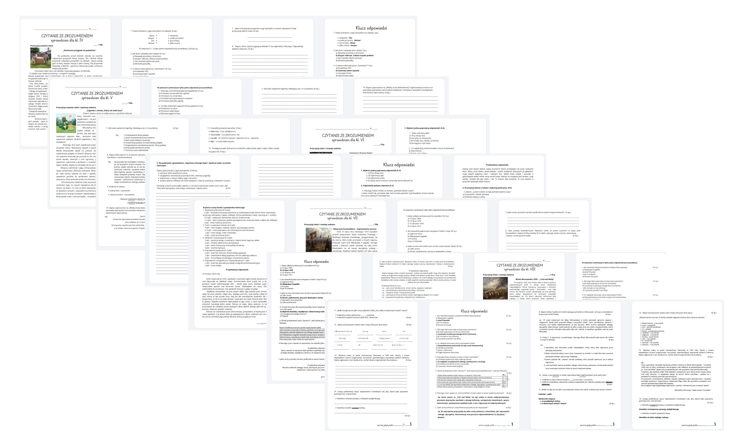 Kompleksowy i wyczerpujący zestaw materiałów dydaktycznych obejmujący wszystkie poziomy szkoły podstawowej (kl. 4–8). To gotowe rozwiązanie, które pozwala systematycznie rozwijać umiejętność czytania ze zrozumieniem na każdym etapie edukacji.