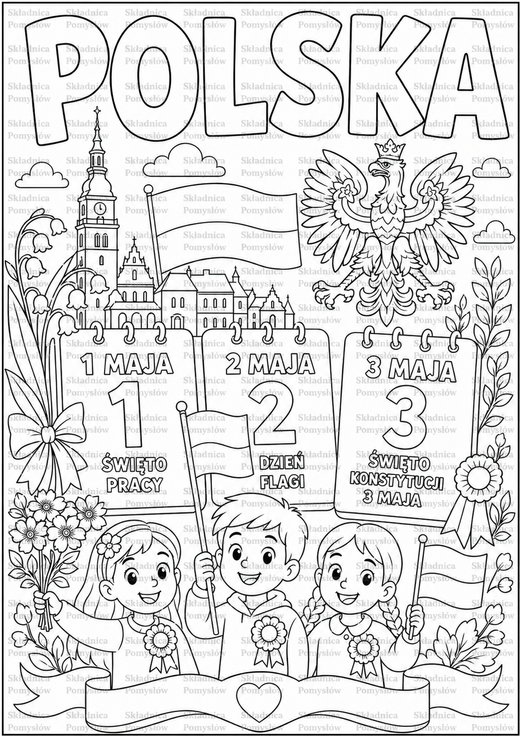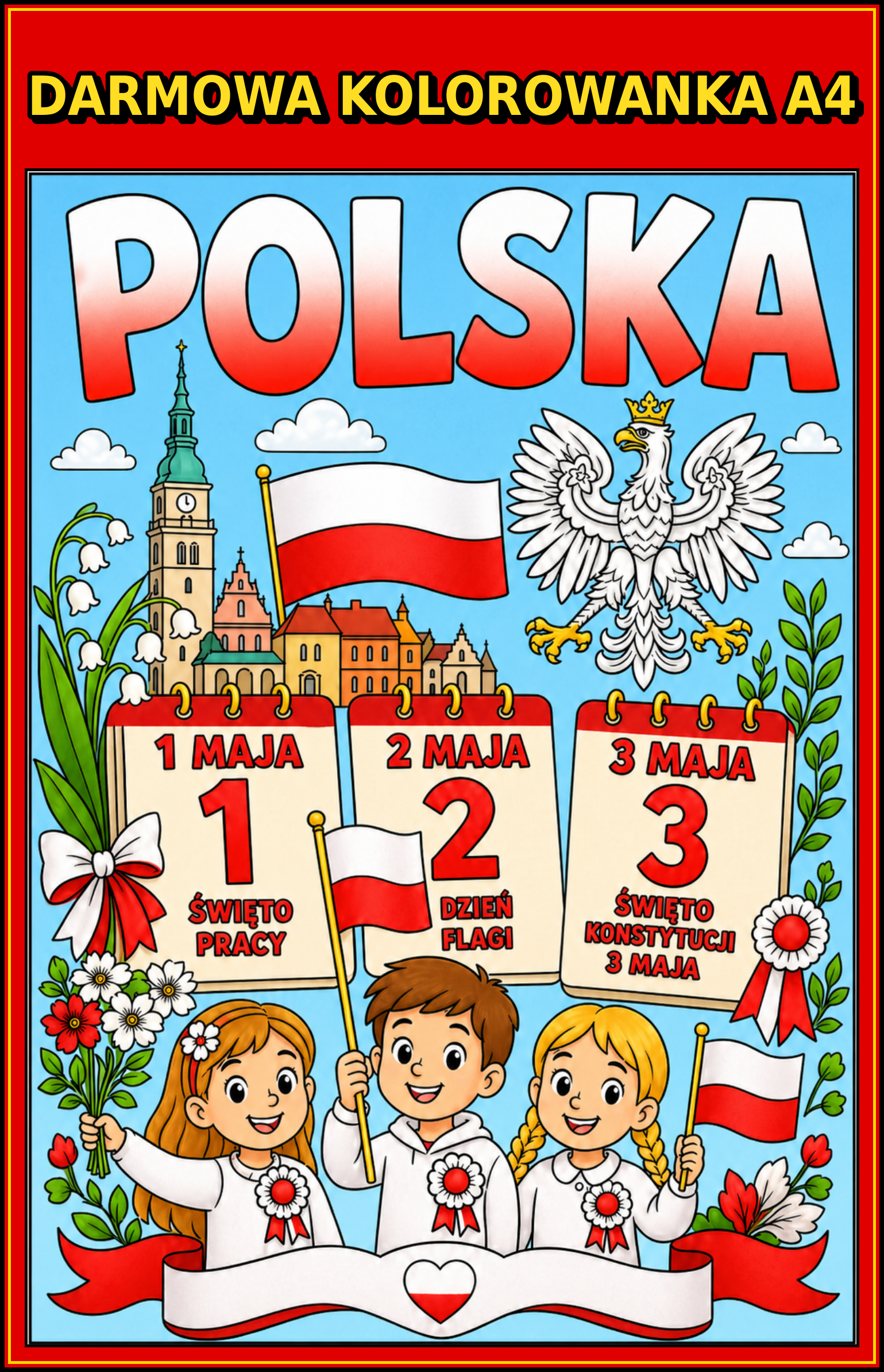 Starannie opracowana, jednokartkowa kolorowanka edukacyjna w formacie A4, poświęcona świętom majowym (1–3 maja). Kompozycja łączy wyraziste elementy symboliki narodowej – flagę, godło, architekturę oraz dziecięce postacie – tworząc spójną, estetyczną całość sprzyjającą pracy dydaktycznej i aktywizacji uczniów.