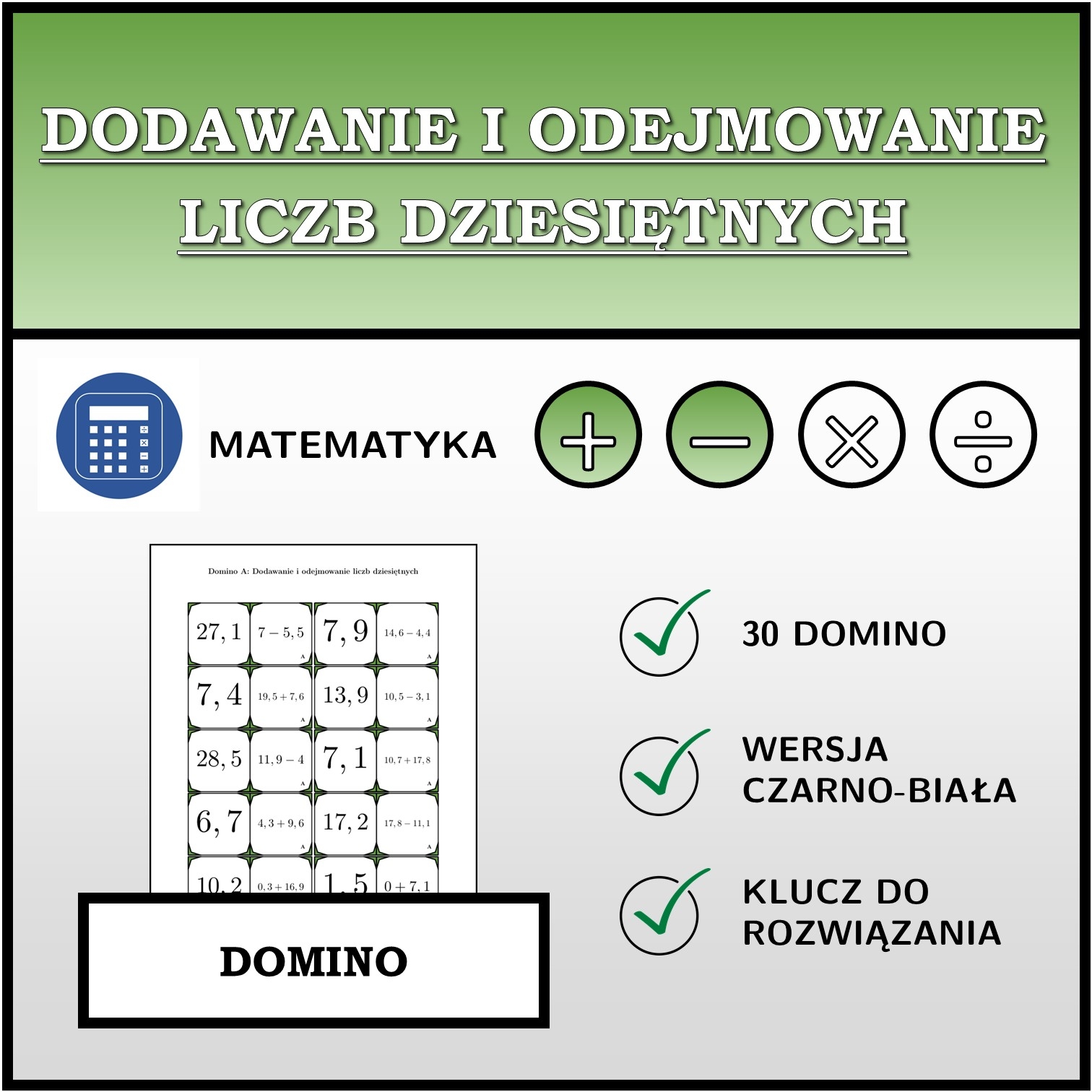 W materiale znajduje się łącznie 30 różnych zestawów domina na temat dodawanie i odejmowanie liczb dziesiętnych w następującym układzie: