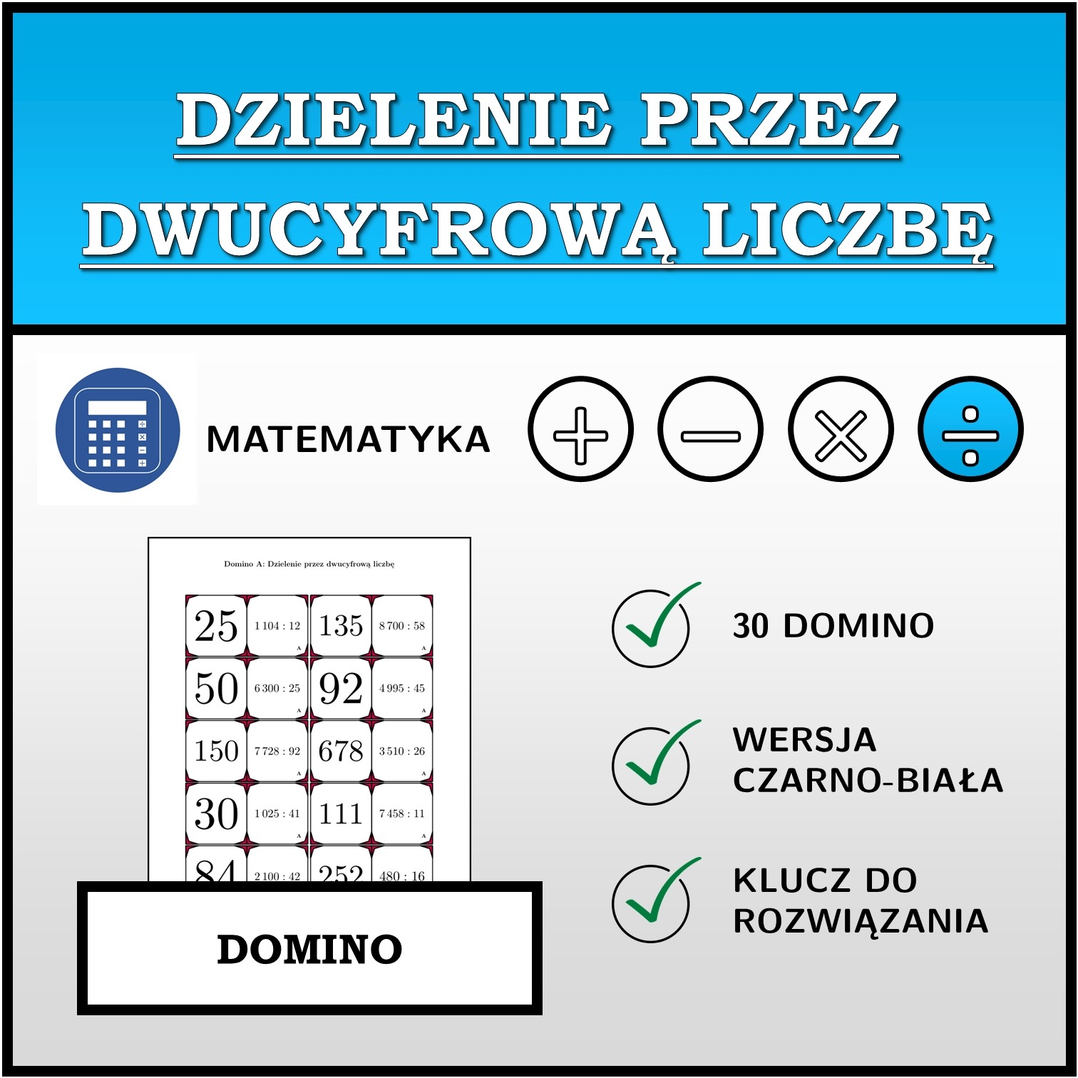 W materiale znajduje się łącznie 30 różnych zestawów domina na temat dzielenie przez dwucyfrową liczbę w następującym układzie: