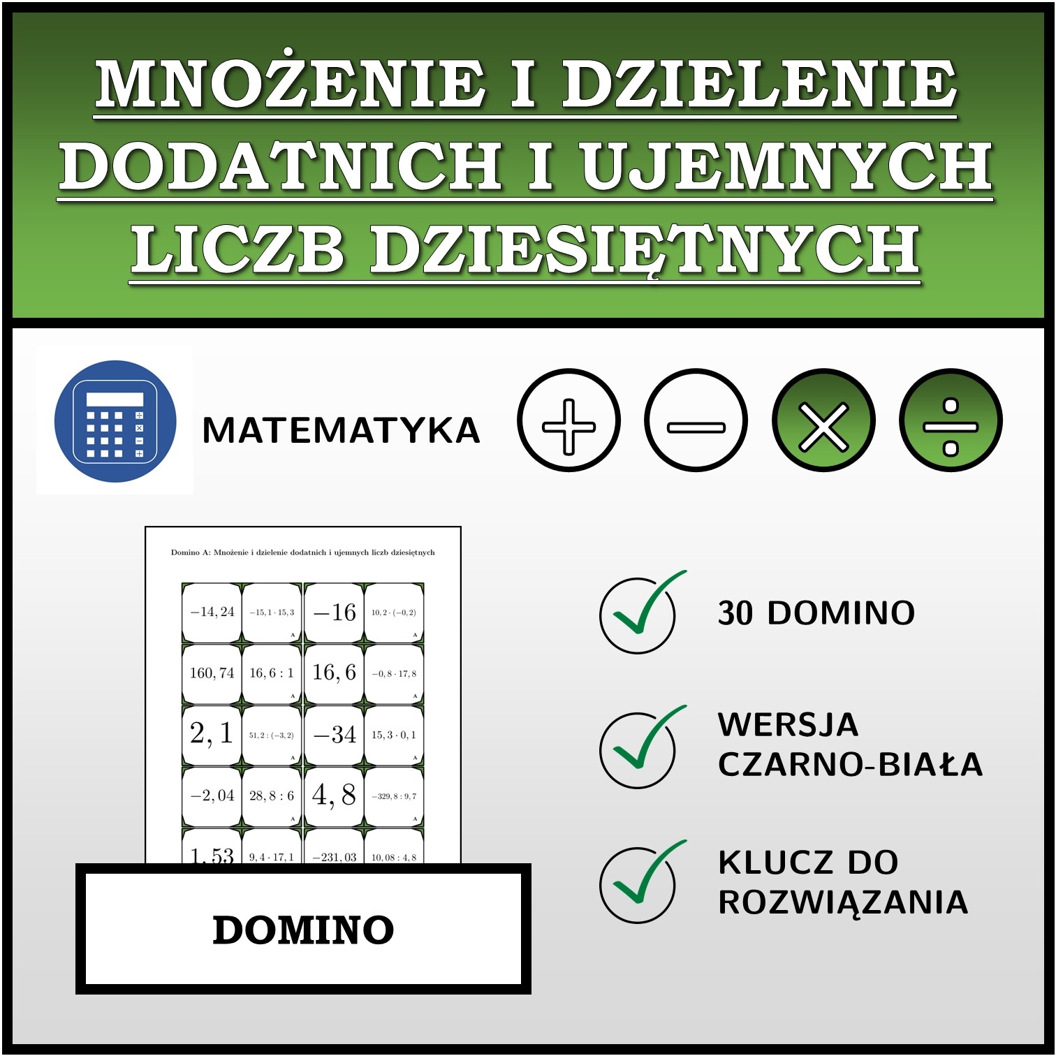 W materiale znajduje się łącznie 30 różnych zestawów domina na temat mnożenie i dzielenie dodatnich i ujemnych liczb dziesiętnych w następującym układzie: