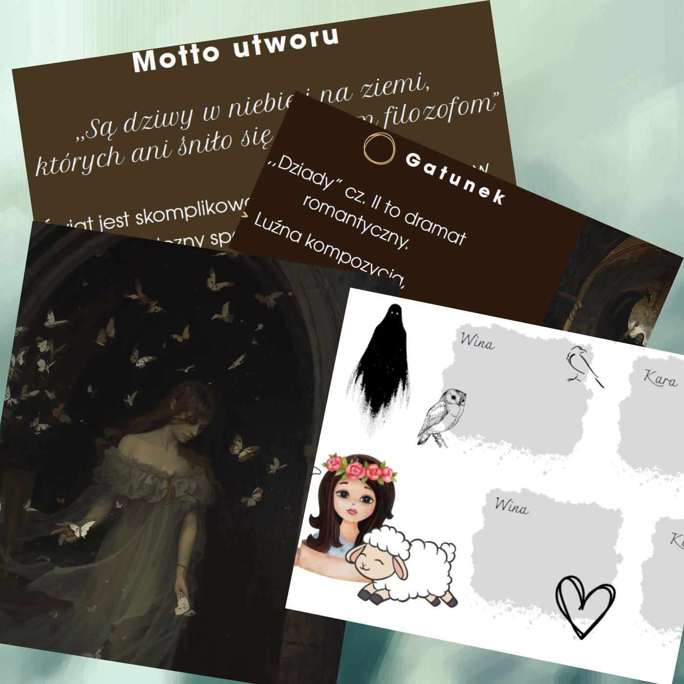 Prezentacja pomaga uporządkować najważniejsze informacje o lekturze. Uczniowie poznają obrzęd dziadów, bohaterów oraz płynące z historii przestrogi. Uwzględniony został też rodzaj i gatunek literacki, wyjaśnienie motta utworu.