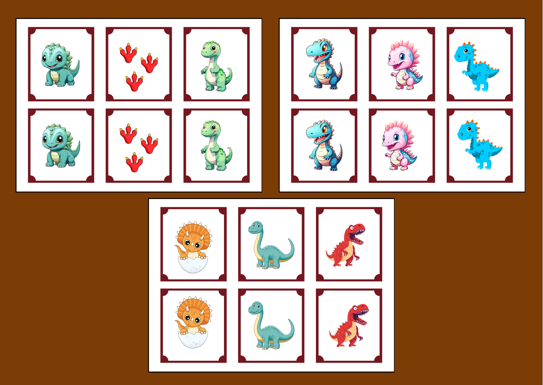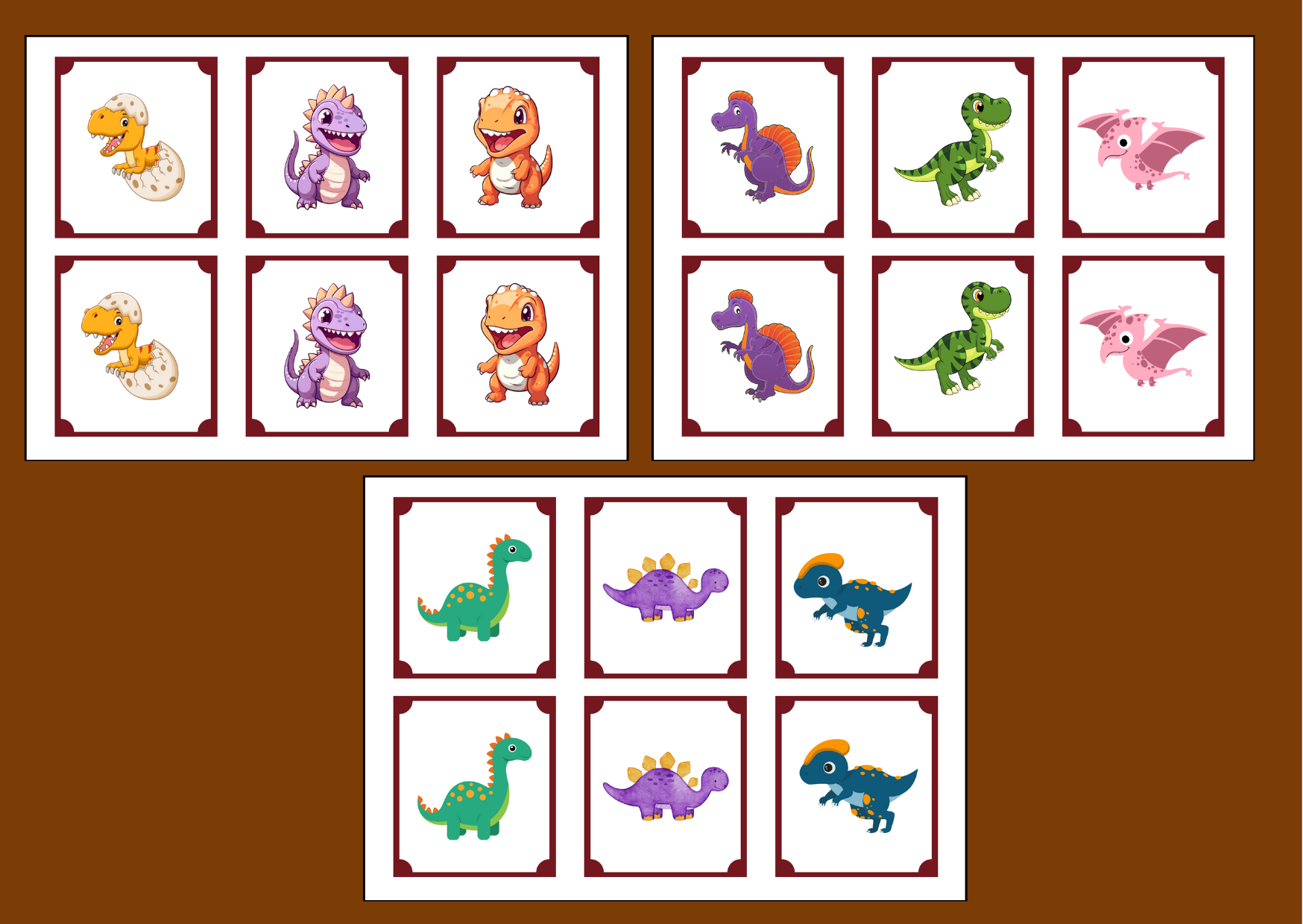 Gra memory uczy dzieci skupienia i koncentracji. Proponuję memory z ilustracjami z dinozaurami (6 stron, na każdej po 6 ikonek). Po wycięciu materiał można zalaminować, aby dłużej służył.