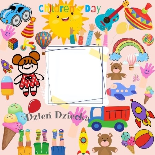 W zestawie 39 kartek z różnymi grafikami w celu stworzenia kreatywnej ramki z okazji Dnia Dziecka czy uroczystości przedszkolnych lub szkolnych. Grafiki należy wydrukować, wyciąć oraz wyeksponować wg własnego pomysłu. Karty te zawierają również napis Dzień Dziecka w kilku odsłonach. Przykładowa ramką stworzona dla Państwa na wzór.
