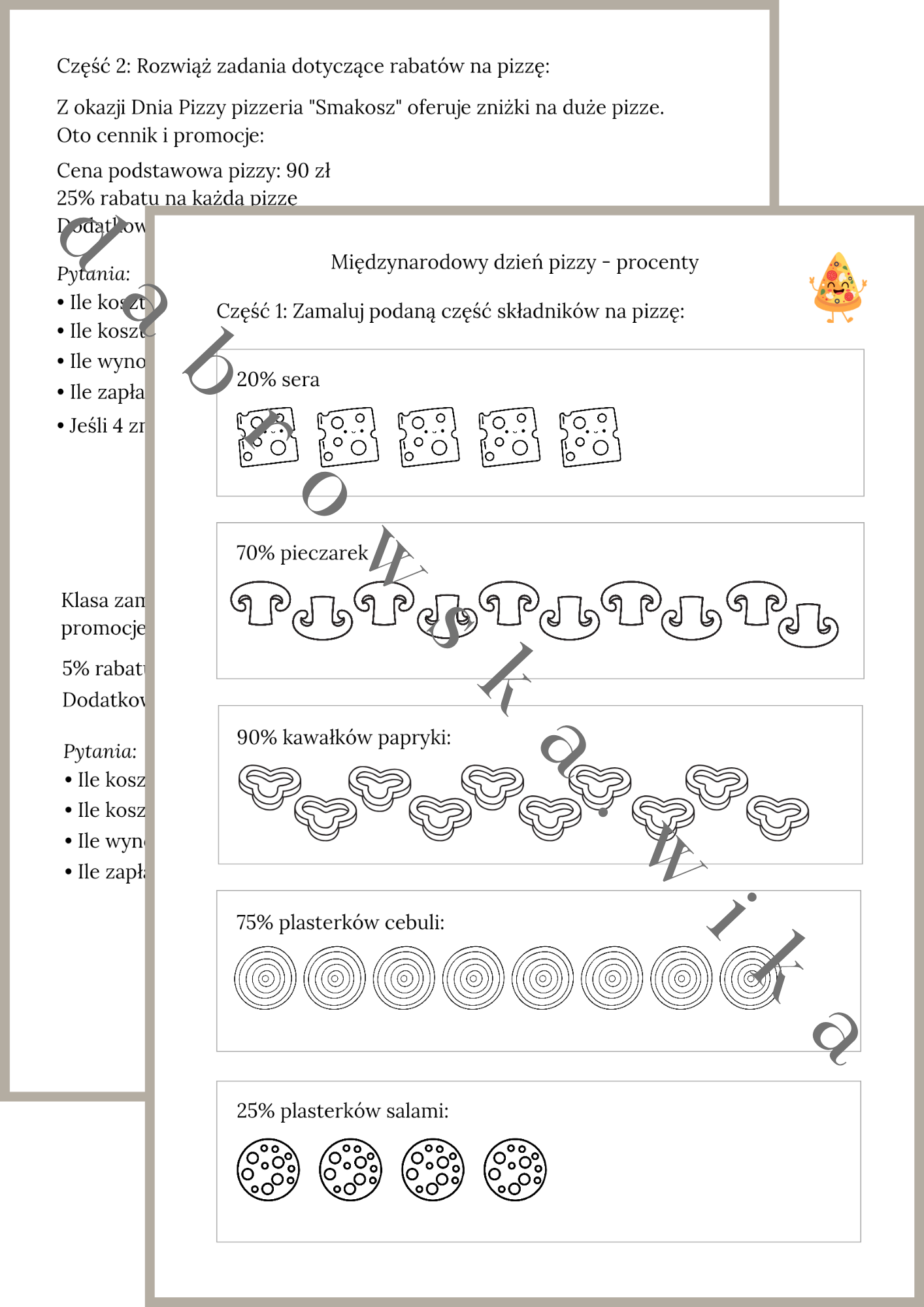 1. Kolorowanie składników pizzy według podanych procentów – uczniowie zamalowują określoną część składników, ucząc się procentów w praktyce.