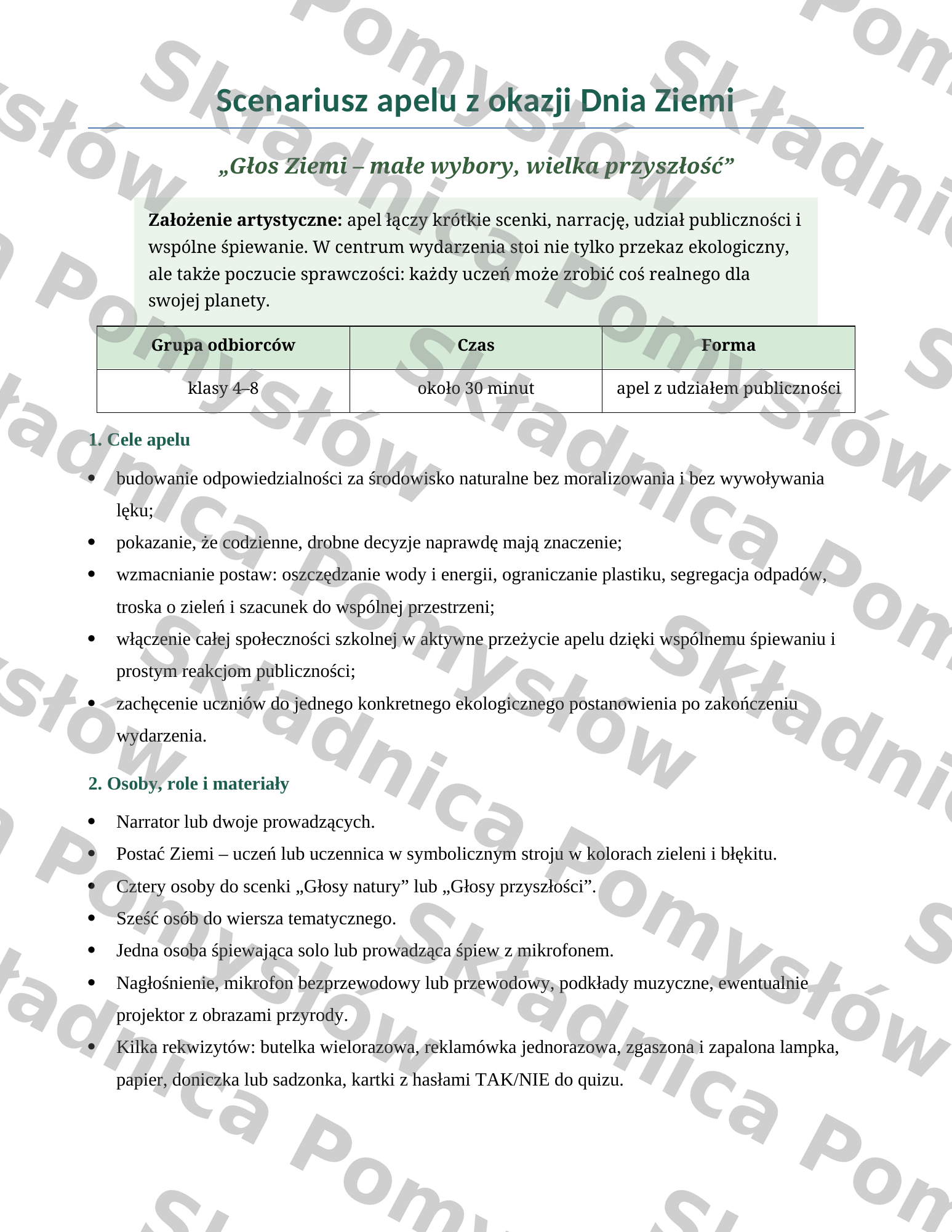 Materiał został opracowany z myślą o przygotowaniu szkolnego wydarzenia w atrakcyjnej, angażującej i uporządkowanej formie. Łączy treści ekologiczne z elementami artystycznymi i aktywnym udziałem uczniów oraz publiczności. Scenariusz pomaga sprawnie zorganizować apel i przeprowadzić go bez konieczności tworzenia programu od podstaw (czas trwania apelu - około 30 minut).