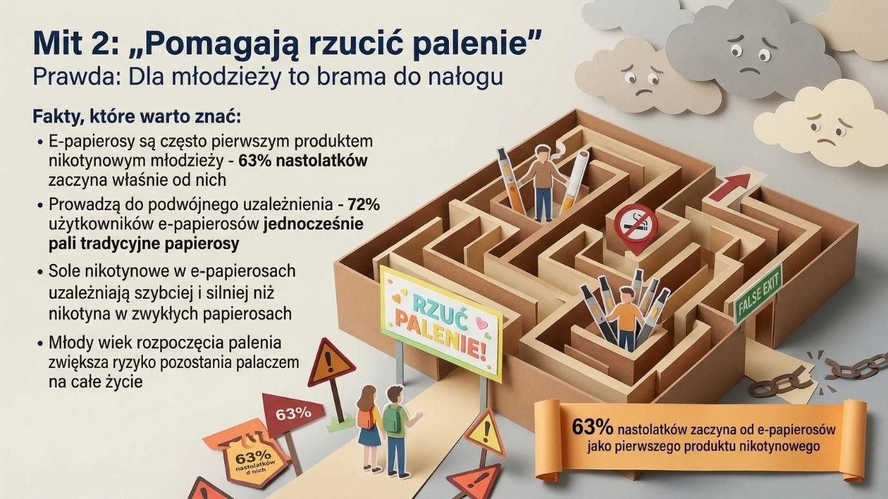 Z materiałem można pracować jako gazetką szkolną, umieszczając plansze na korytarzu, przy gabinecie pedagoga lub w sali biologicznej, ale bardzo dobrze sprawdzi się też jako prezentacja na godzinie wychowawczej albo zajęciach profilaktycznych. Najlepiej omawiać go modułowo: najpierw czym są e-papierosy i co zawierają, potem jakie niosą zagrożenia, a na końcu jak reagować na presję i dlaczego „spróbować tylko raz” też może być początkiem problemu. Dobrym zakończeniem zajęć jest krótka rozmowa klasowa o mitach i faktach oraz stworzenie listy argumentów, które pomagają powiedzieć „nie”.