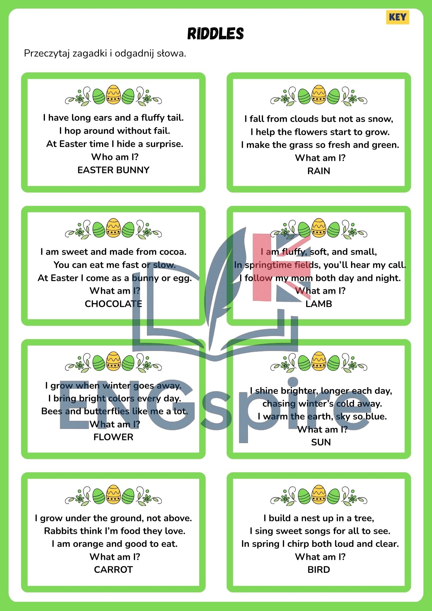 Uczniowie rozwiązują zadania, odczytują wskazówki i krok po kroku odkrywają ukryte hasło (Easter Code). W trakcie aktywności rozwijają słownictwo oraz umiejętności komunikacyjne w naturalny sposób.