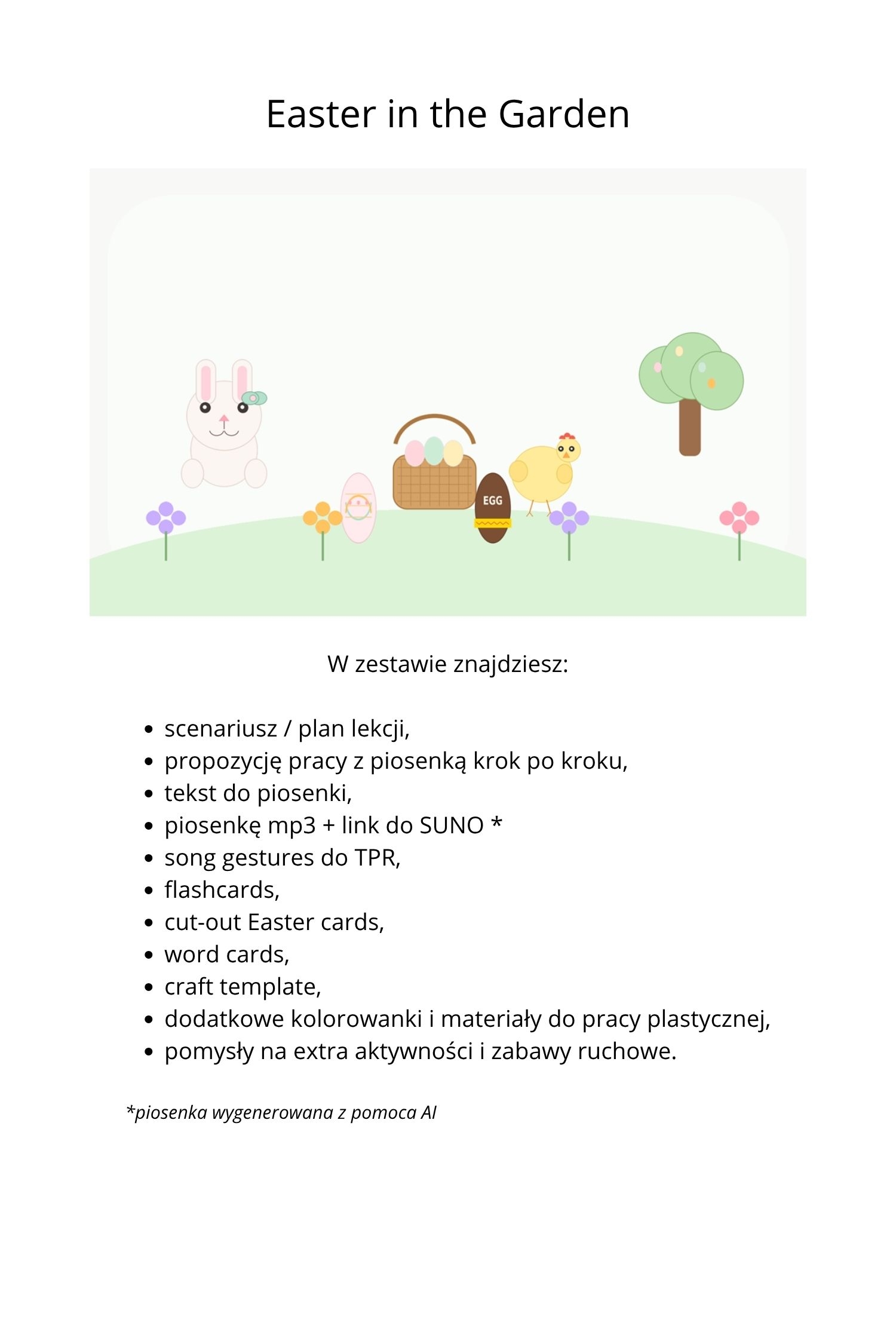 Easter in the Garden to gotowy zestaw na wielkanocne zajęcia z angielskiego w przedszkolu. Materiał łączy piosenkę, ruch, zabawę i pracę plastyczną, dzięki czemu dzieci uczą się słownictwa w naturalny i angażujący sposób.
