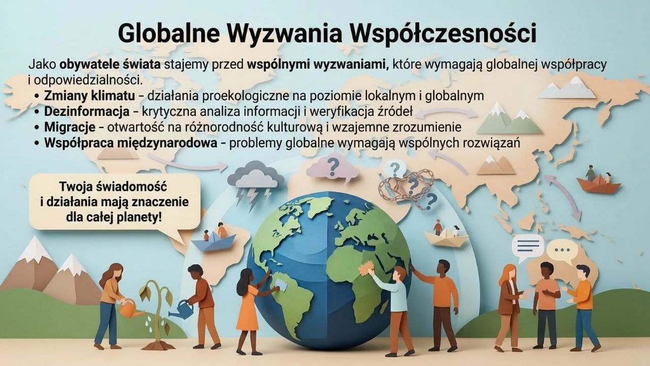 W dalszej części uczniowie poznają zasady wyborów i znaczenie udziału w głosowaniu (slajd 14), a także korzyści wynikające z członkostwa Polski w Unii Europejskiej (slajd 15). Kolejna plansza porusza temat globalnych wyzwań współczesnego świata, takich jak zmiany klimatu czy dezinformacja (slajd 16).