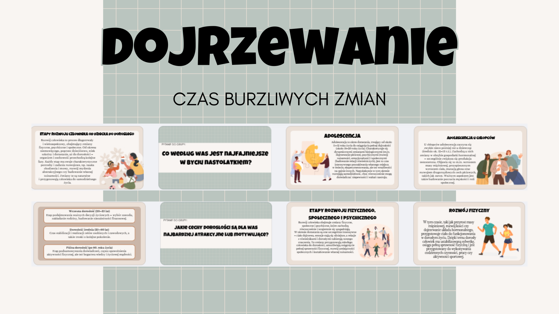 Prezentacja „Dorastanie – czas burzliwych zmian” to gotowy materiał edukacyjny dla nauczycieli klas 7, który w atrakcyjny i merytoryczny sposób wprowadza uczniów w temat adolescencji. Zawiera spójne, przystępnie sformułowane treści dotyczące etapów rozwoju człowieka, zmian fizycznych, psychicznych i społecznych w okresie dorastania oraz ich znaczenia dla dorosłości. Materiał uwzględnia specyficzne cechy dorastania u chłopców i dziewcząt, rozwój sprawności fizycznej oraz praktyczne wskazówki dla nastolatków, jak radzić sobie z emocjami i wyzwaniami tego okresu.