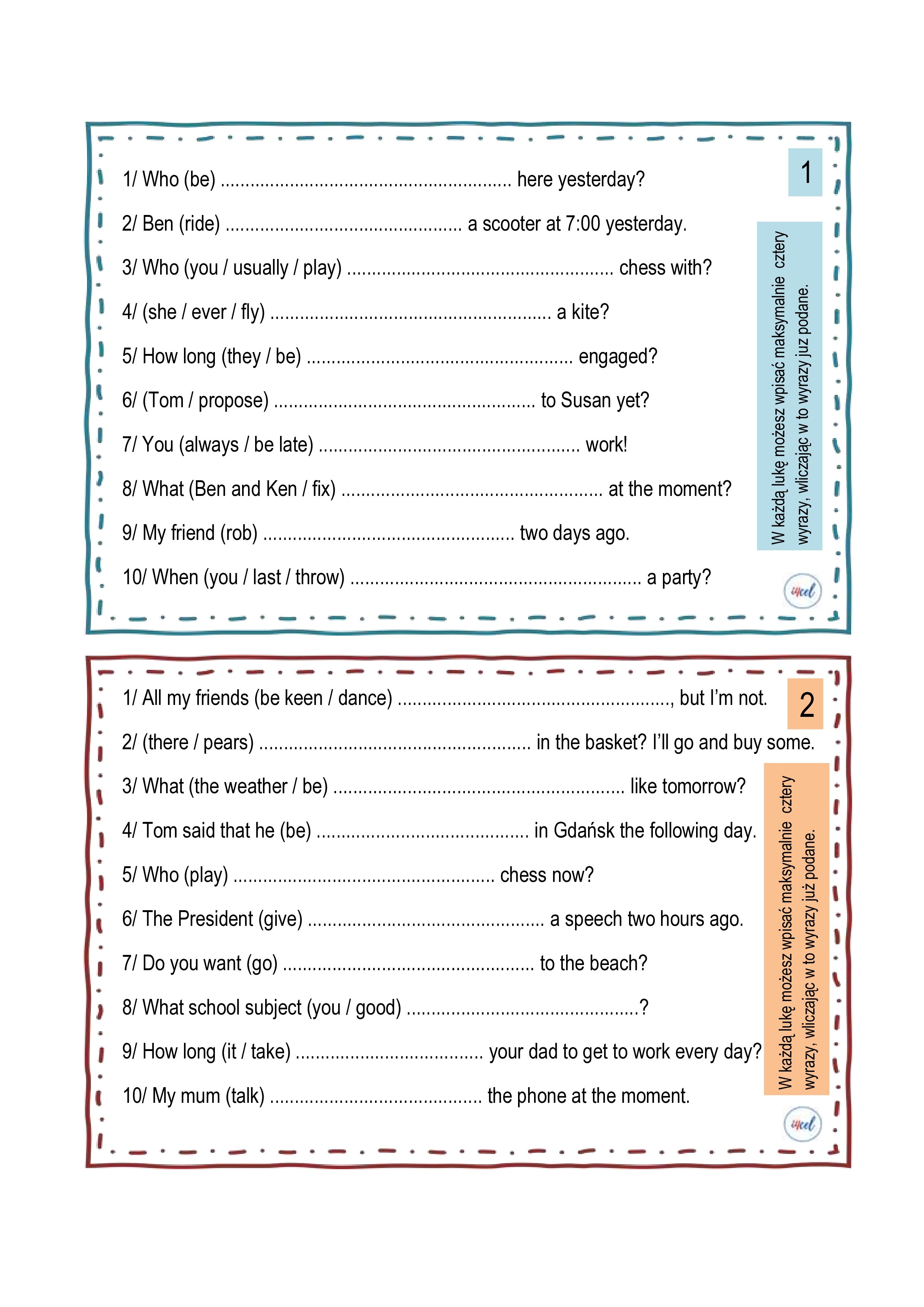 Zadaniem ucznia wykorzystać w odpowiedniej formie wyrazy podane w nawiasach. Jeżeli to konieczne, należy dodać inne wyrazy, tak aby otrzymać zdania logiczne i gramatycznie poprawne. W każdą lukę można wpisać maksymalnie cztery wyrazy, wliczając w to wyrazy już podane.