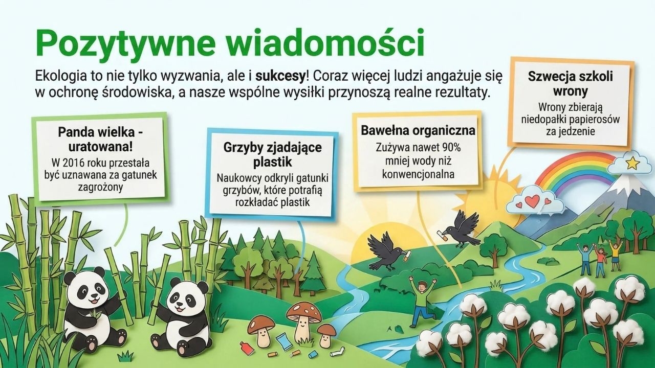 To estetyczna gazetka/prezentacja PDF w stylu papierowej makiety, która pokazuje ekologię jako temat „tu i teraz” i prowadzi uczniów od zrozumienia problemów środowiskowych do konkretnych działań. Zestaw zawiera 1 plik PDF i 15 stron/15 plansz. Materiał zaczyna się okładką „Ekologia” (str. 1), a następnie wyjaśnia, czym jest ekologia i jak elementy środowiska są ze sobą połączone (str. 2). Kolejne plansze przedstawiają najważniejsze wyzwania: „Góra śmieci” z informacjami o skali odpadów i czasie rozkładu (str. 3), „Plastik w oceanach” z wątkiem mikroplastiku i wielkiej plamy śmieci (str. 4), „Zanieczyszczenie powietrza” (smog, skutki zdrowotne, kwaśne deszcze) (str. 5), „Wylesianie i utrata bioróżnorodności” (str. 6) oraz „Zmiany klimatu” z przyczynami i skutkami (str. 7). Druga część materiału skupia się na rozwiązaniach: zasada 5R – odmawiaj i ograniczaj (str. 8), użyj ponownie i przetwarzaj (str. 9), kompostuj (str. 10), oszczędzaj wodę i energię (str. 11) oraz pomagaj naturze lokalnie (sadzenie roślin przyjaznych zapylaczom, karmniki, domki dla owadów, udział w akcjach typu sprzątanie świata i sadzenie drzew) (str. 12). Bardzo wartościowa jest plansza „Pozytywne wiadomości” pokazująca, że działania mają sens (str. 13), a całość kończą motywujące plansze: „Twoja mała zmiana ma wielkie znaczenie” (str. 14) oraz finał „Bądź zmianą, którą chcesz zobaczyć w świecie!” (str. 15).