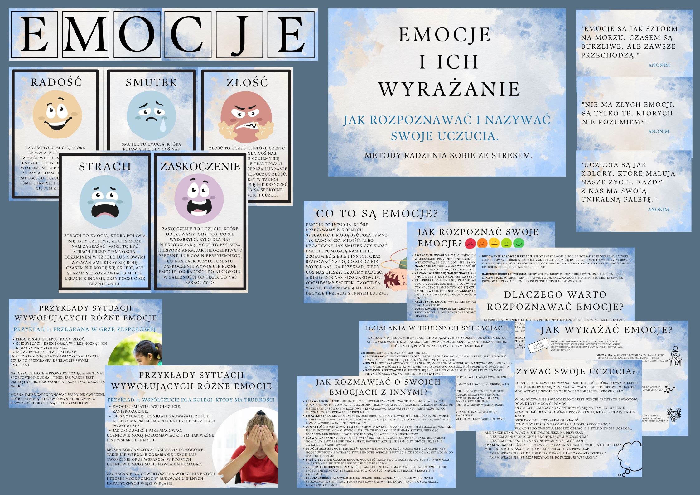 Zachęć swoich uczniów do odkrywania świata emocji dzięki naszemu unikalnemu zestawowi plakatów i plansz „Emocje i ich wyrażanie: Jak rozpoznawać i nazywać swoje uczucia. Metody radzenia sobie ze stresem.”