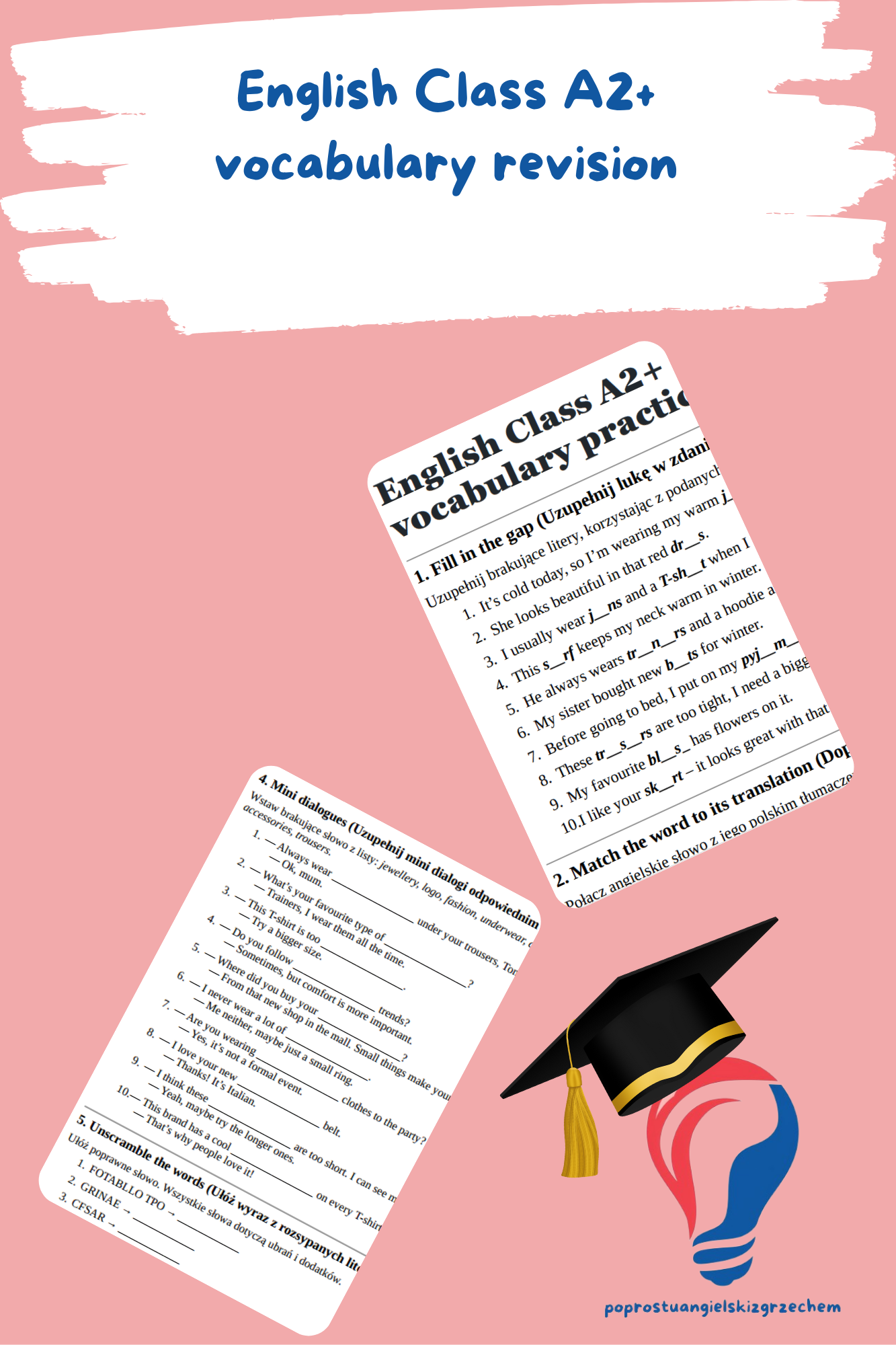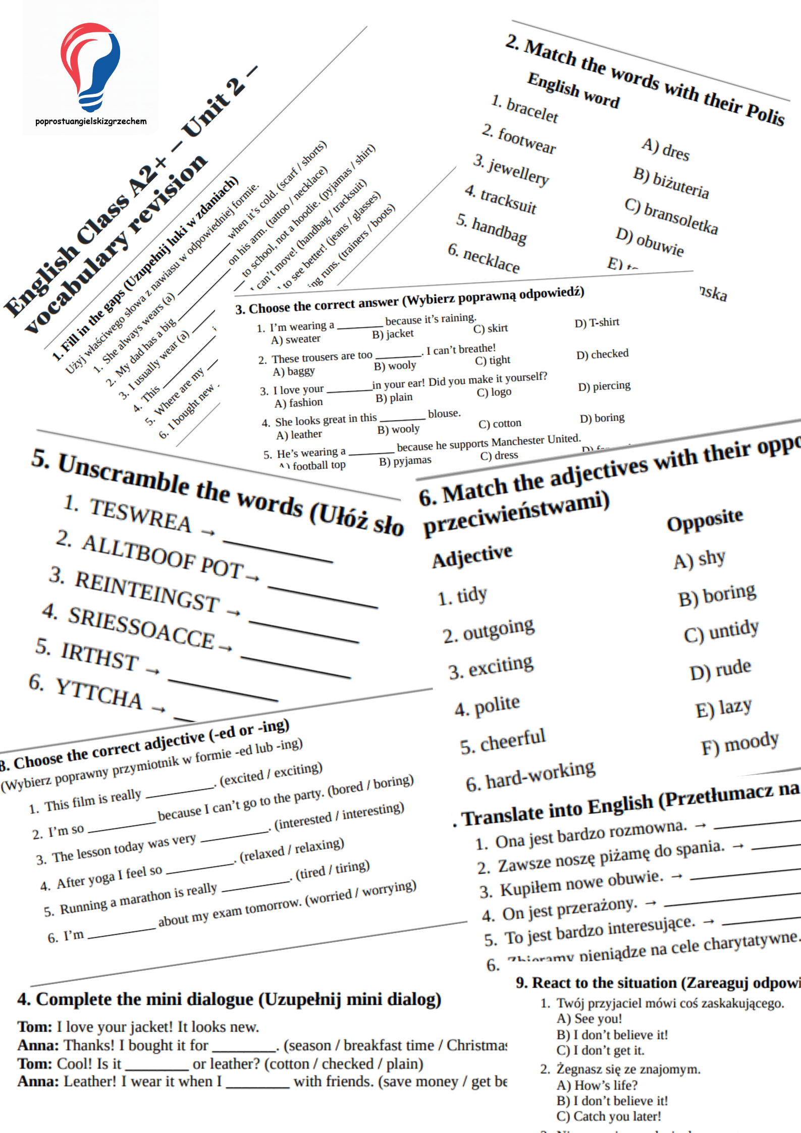 Dziesięć zadań na słownictwo do działu drugiego z podręcznika English Class A2+. Słownictwo z działu pierwszego w postaci testów możesz znaleźć tutaj, w postaci karty pracy tutaj, a w postaci krzyżówek tutaj. Niniejsze zadania możesz wykorzystać do przeprowadzenia powtórki, kartkówki lub do utrwalenia materiału ze słownictwa.