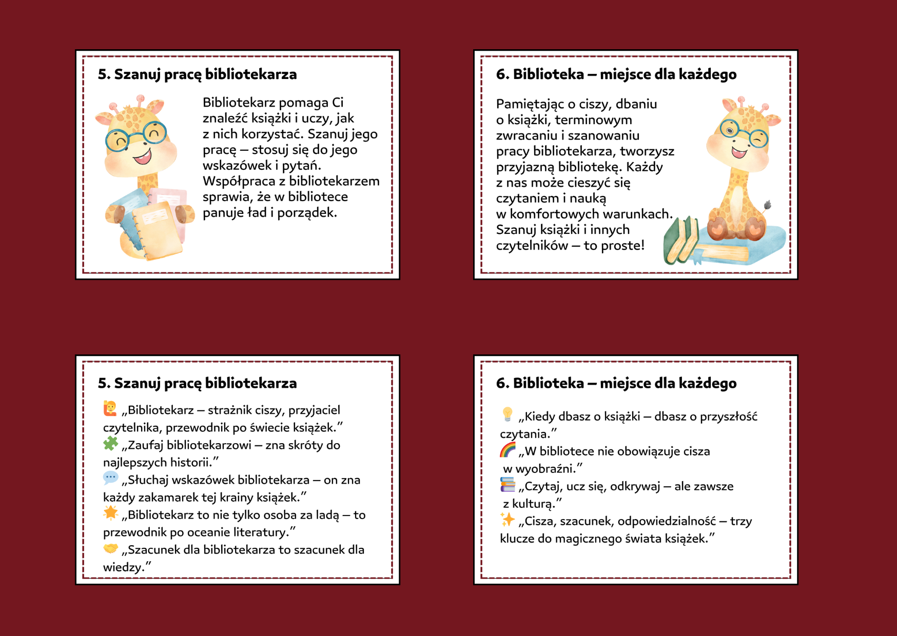 ✨Pomaga rozwijać szacunek do książek, ciszy i pracy bibliotekarza.