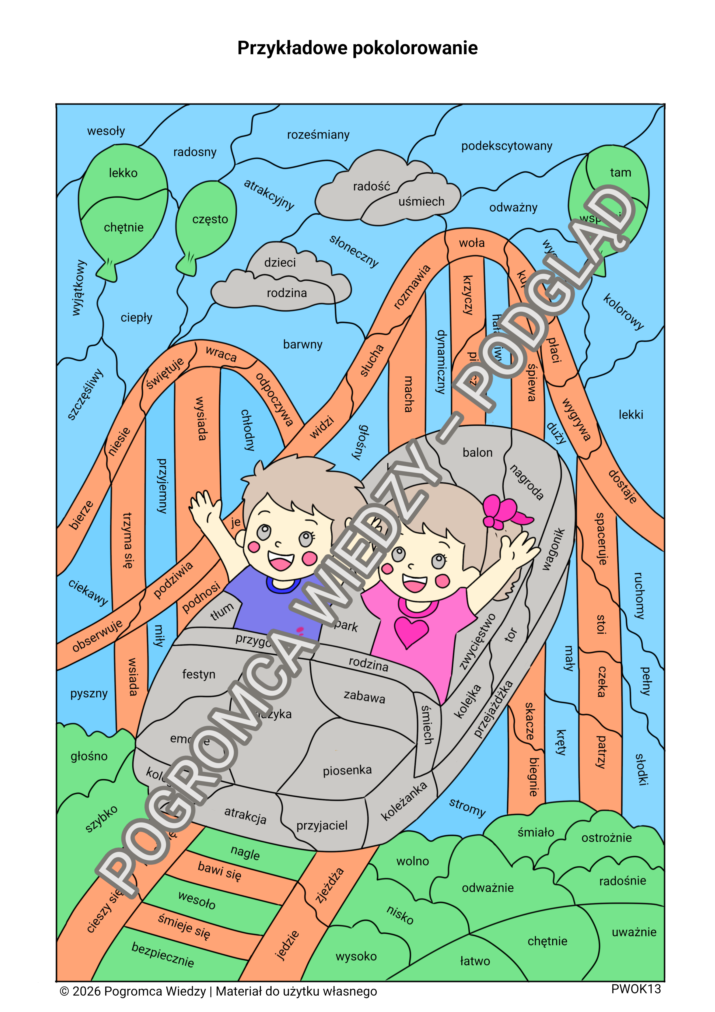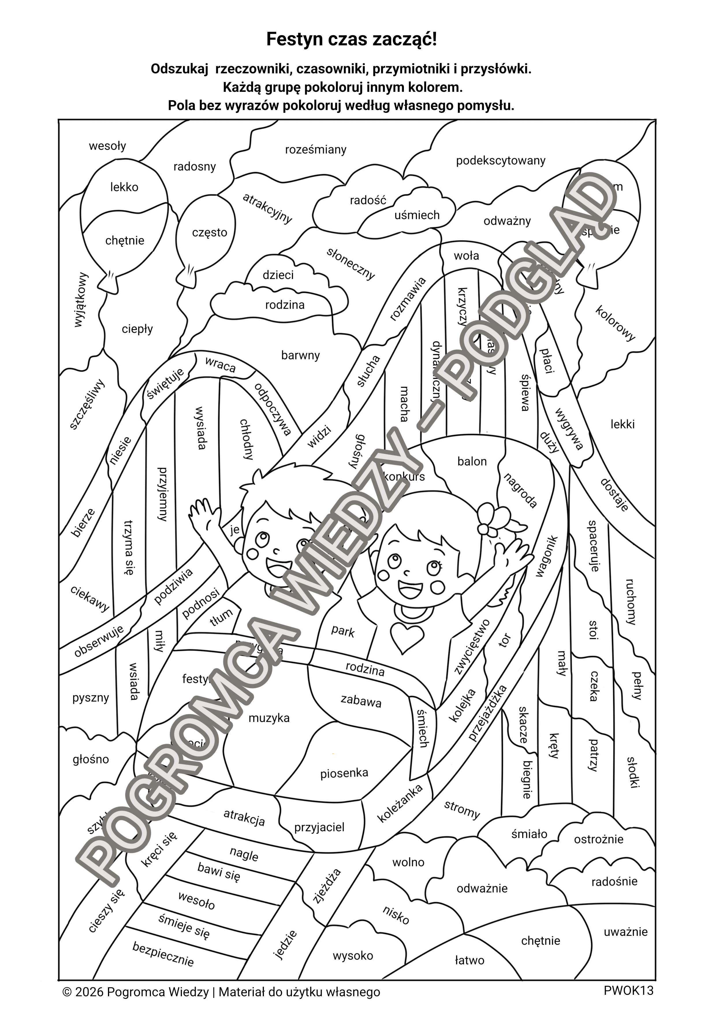 Karta pracy „Festyn czas zacząć!” to angażujące zadanie rozwijające znajomość części mowy oraz słownictwo w atrakcyjnej, tematycznej formie. Uczniowie wyszukują rzeczowniki, czasowniki, przymiotniki i przysłówki, a następnie kolorują je według określonych zasad, co pomaga utrwalić wiedzę w praktyce. Dodatkowo kolorowanie pozostałych pól wspiera kreatywność, koncentrację i wyciszenie. Materiał zawiera również odpowiedzi, dzięki czemu sprawdzi się zarówno podczas lekcji, jak i do pracy samodzielnej.