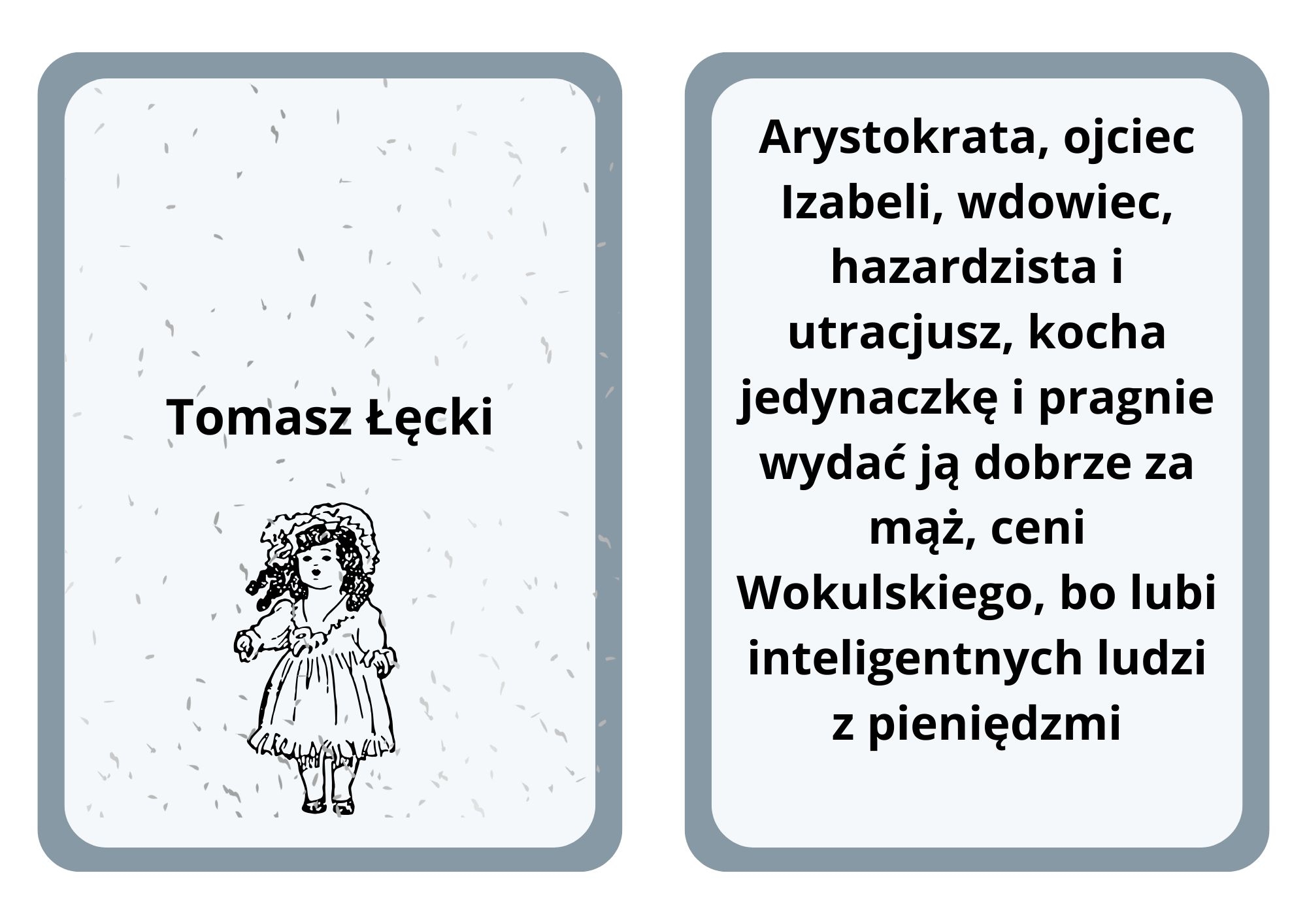 Polecam zestaw kart, bohaterowie powieści "Lalka", opisy postaci krótkie i treściwe, karty można wykorzystać przy omówieniu lektury, a także do powtórek maturalnych czy quizów.
