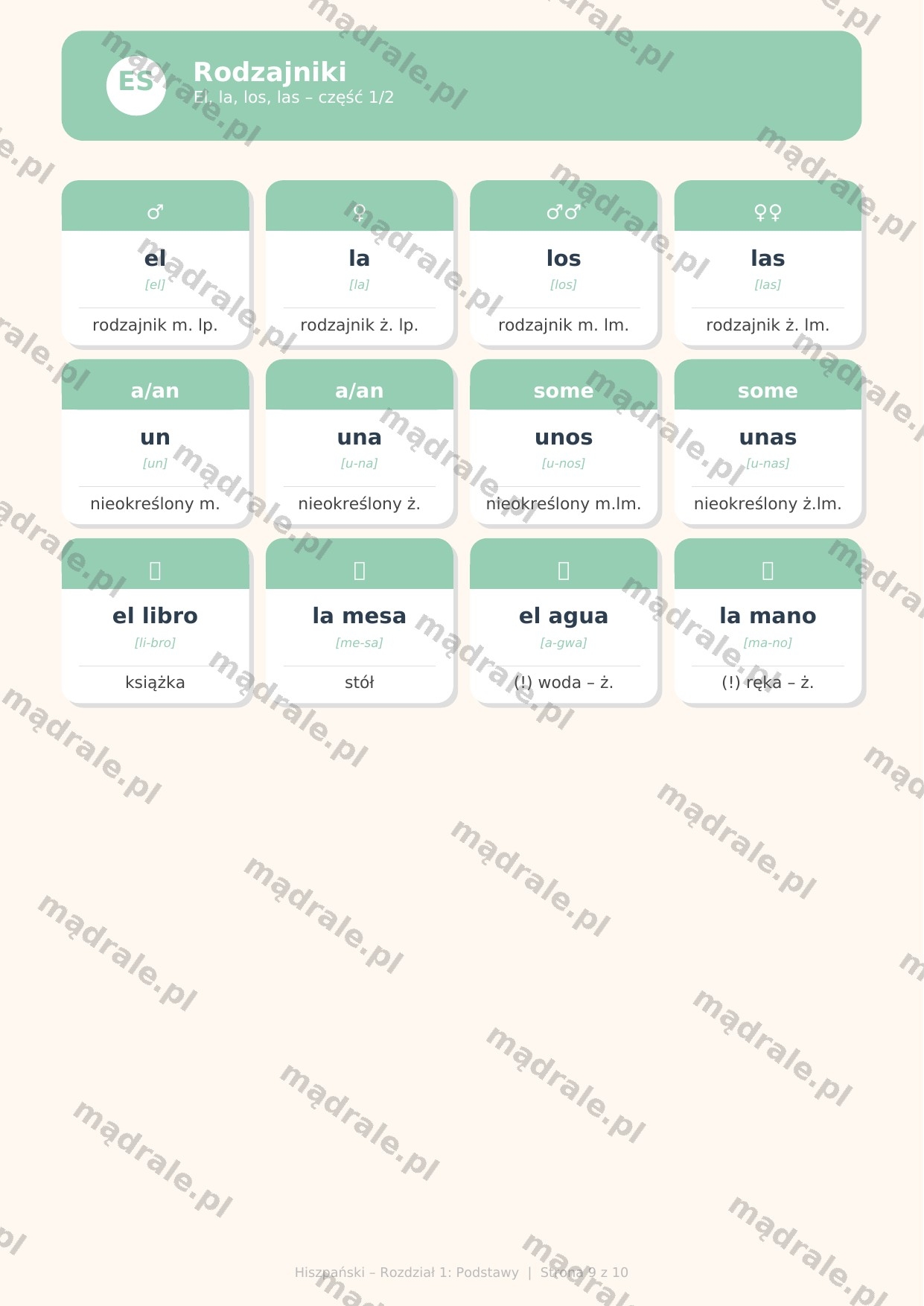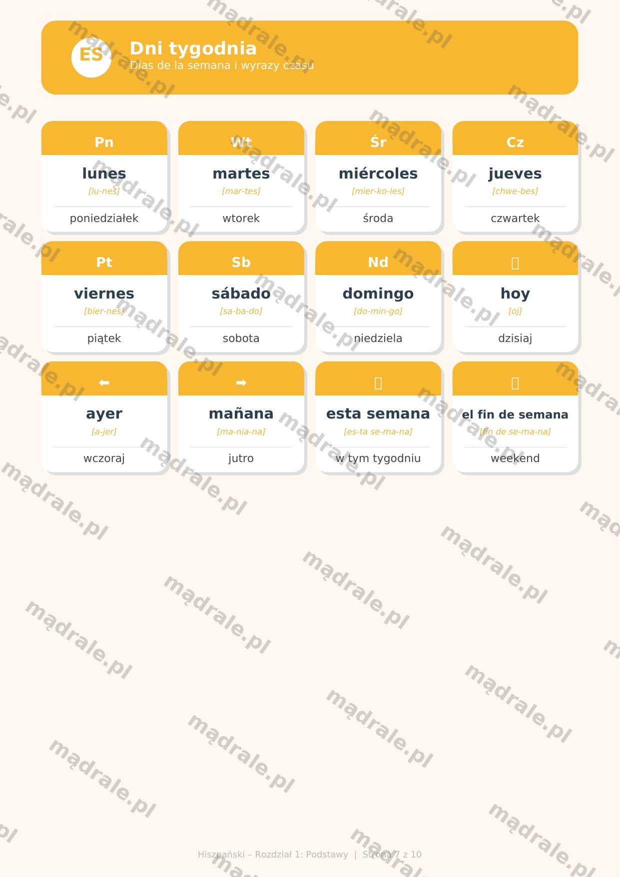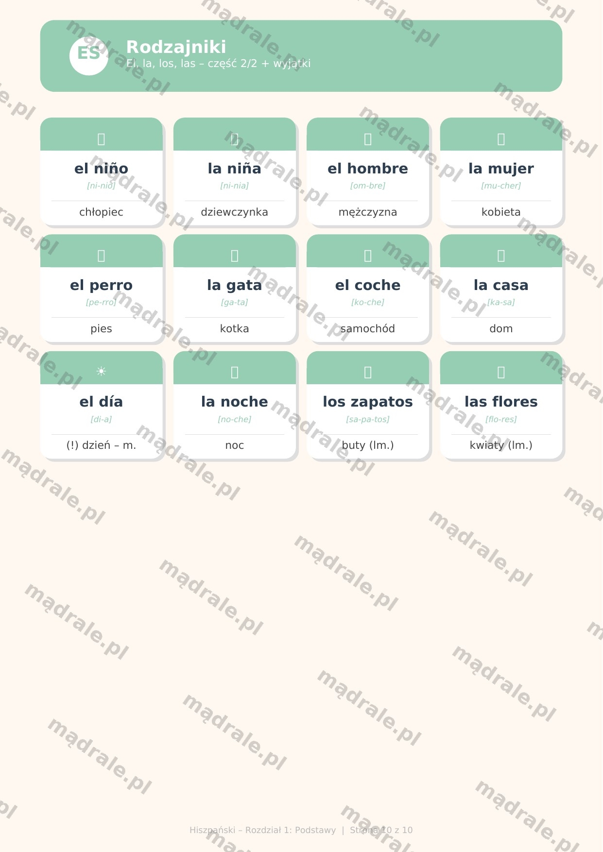📝 Fiszki tematyczne do nauki języka hiszpańskiego – Rozdział 1 (m.in. alfabet i wymowa, podstawowe zwroty, liczby, dni tygodnia, miesiące oraz rodzajniki el, la, los, las).