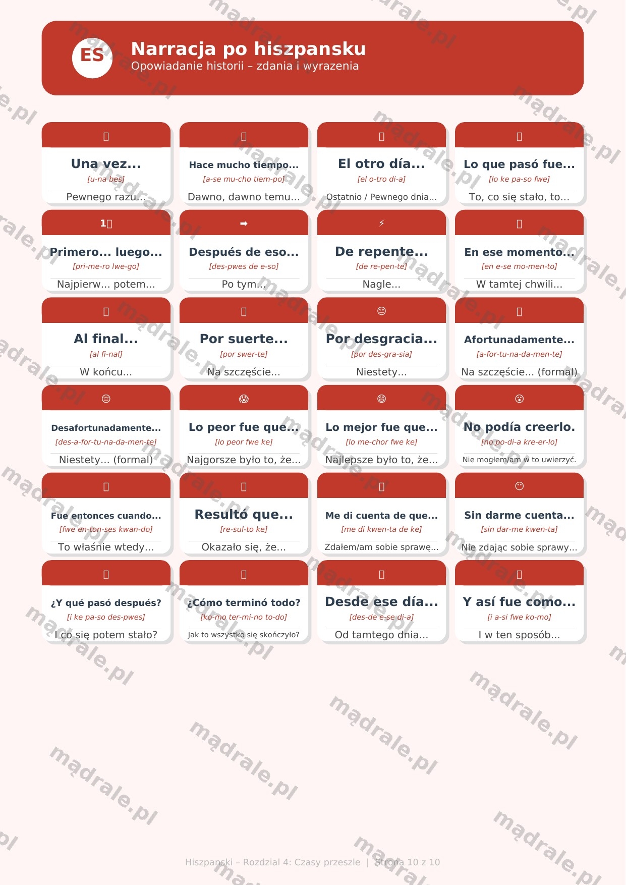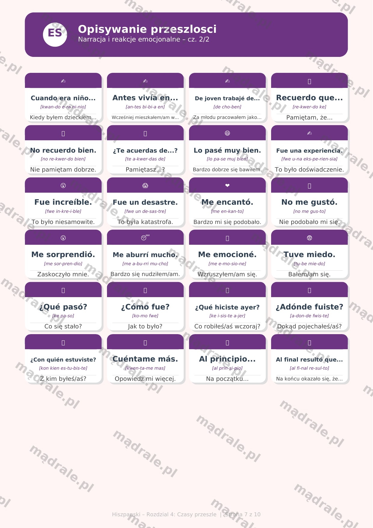 🇪🇸 Fiszki tematyczne do nauki języka hiszpańskiego – Rozdział 4 (m.in. pretérito perfecto – czas przeszły złożony, pretérito indefinido – czas przeszły prosty, koniugacja czasowników regularnych i nieregularnych w przeszłości oraz zwroty do opisywania minionych wydarzeń).