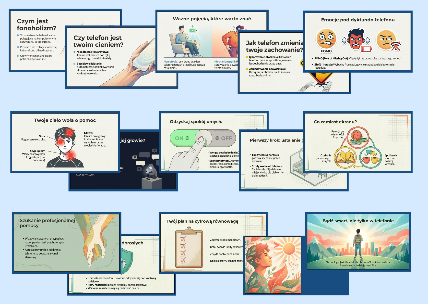 Prezentacja pomaga w otwartej rozmowie o relacji młodych ludzi z telefonem – bez moralizowania, za to z naciskiem na świadomość, równowagę i odpowiedzialność.