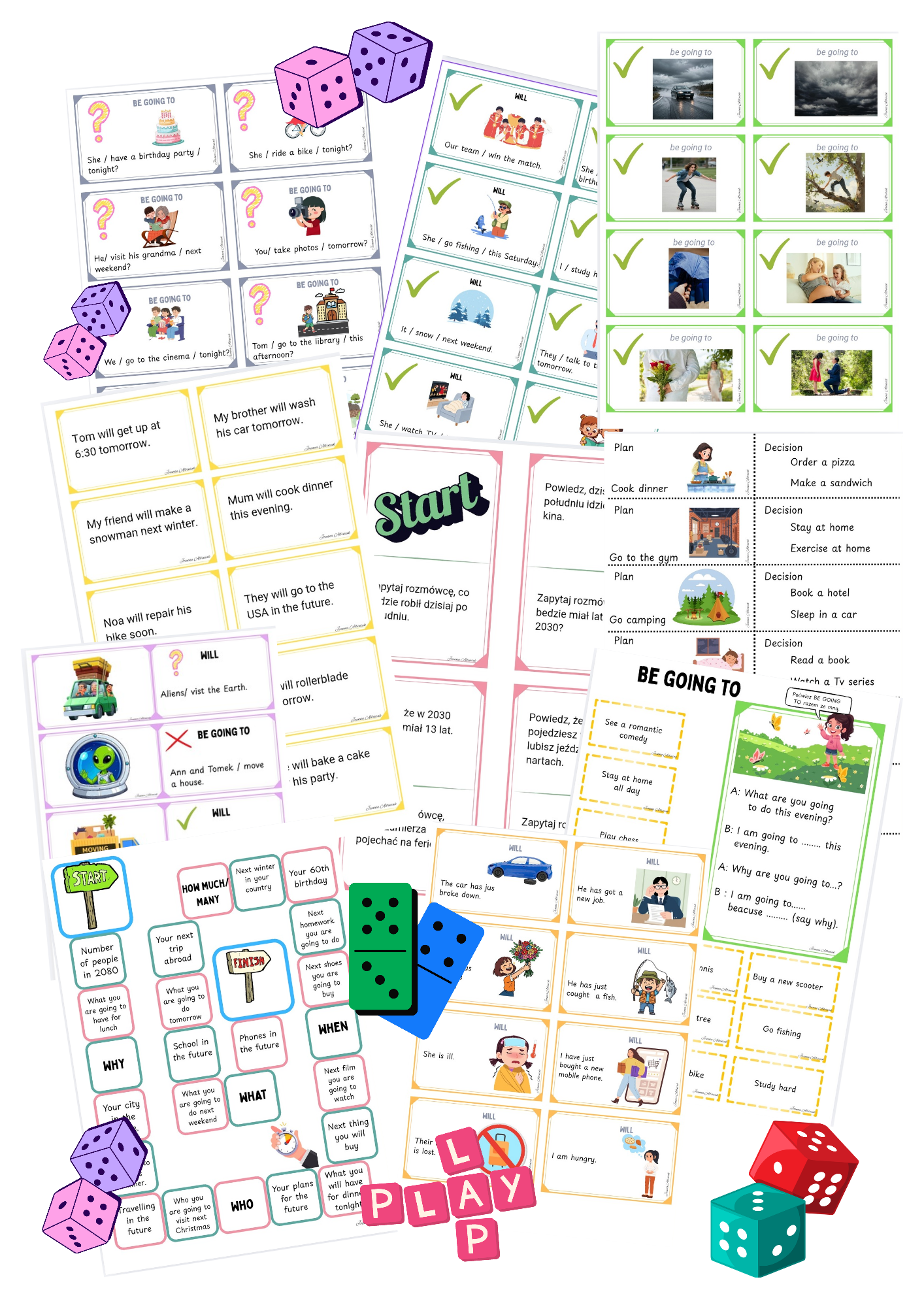 1. Be going to - 24 karty: 8 kart twierdzących, 8 pytających i 8 przeczących do budowania zdan.