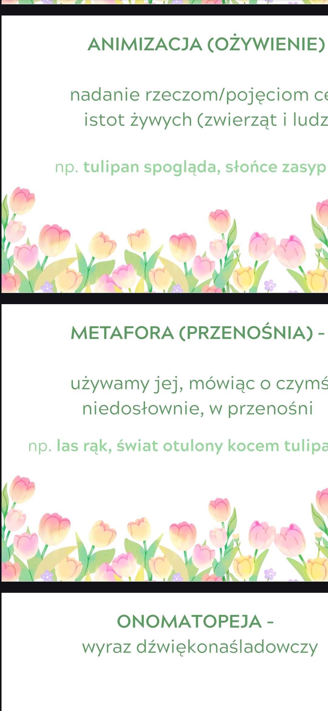Gazetka składa się z 12 poziomych plansz A4 do wydruku. Uwzględniłam następujące środki stylistyczne: epitet, metaforę, personifikację, animizację, zdrobnienie, zgrubienie, pytanie retoryczne, onomatopeję, powtórzenie, porównanie, apostrofę, neologizm, symbol oraz alegorię.