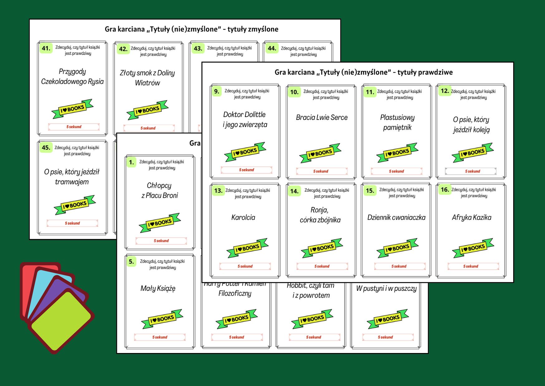 „Tytuły (nie)zmyślone” to wesoła i angażująca gra edukacyjna, w której uczniowie próbują odgadnąć, czy prezentowany tytuł książki istnieje naprawdę, czy został zmyślony. Tytuły bywają zaskakujące, absurdalne lub całkiem prawdopodobne – dlatego gra dostarcza dużo śmiechu i dobrej zabawy! Gra rozwija wyobraźnię, ćwiczy spostrzegawczość, pobudza kreatywne myślenie i zachęca do poznawania literatury dziecięcej i młodzieżowej. Przygotowałam 80 fiszek do wydruku (10 stron po 8 tytułów) - 5 stron z tytułami prawdziwymi i 5 stron z tytułami zmyślonymi.