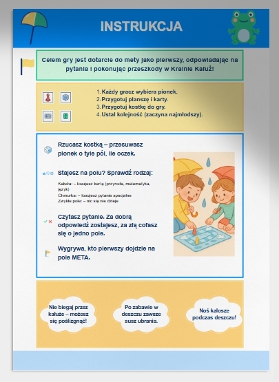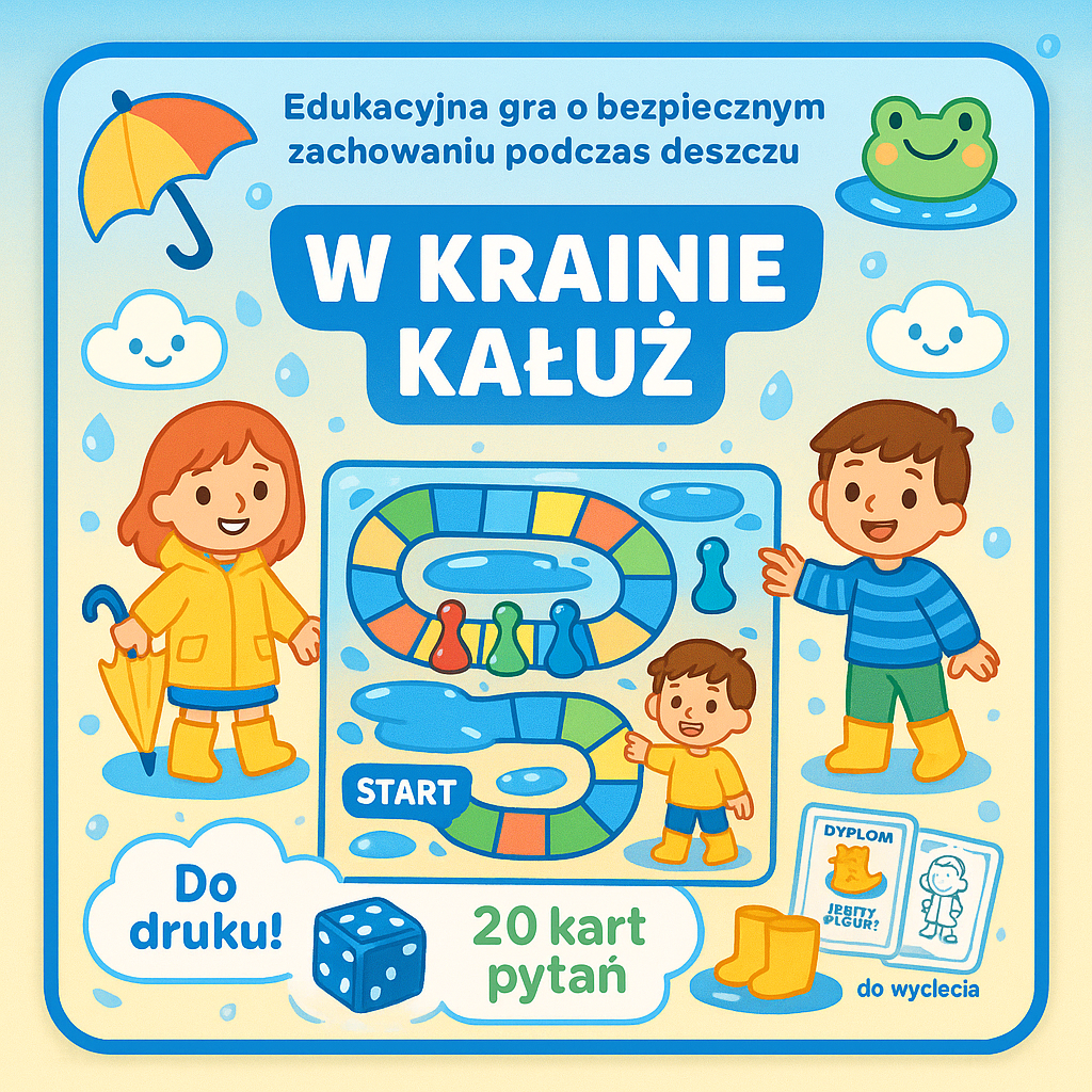 Dodatkowo: dyplom dla zwycięzcy, pionki do wycięcia, medal „Mistrz Kałuż” oraz super kolorowanka! 🎖️🎨