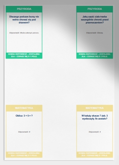 20 kart z pytaniami i zadaniami – aż trzy kategorie: przyroda 🌱, matematyka ➗ i język polski ✏️.
