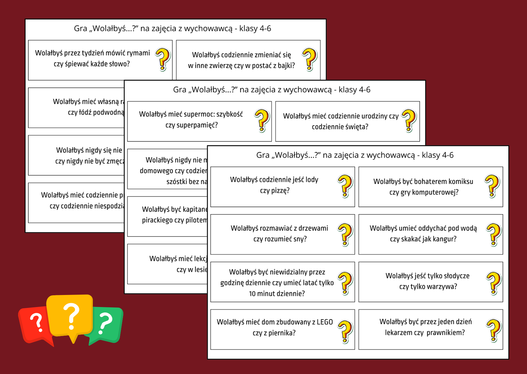 Prosta gra, w której pytania rozpoczynają się od słowa „Wolałbyś…? Opracowałam 80 pytań dla uczniów z klas 4-6 (na innej aukcji proponuję taką grę w wersji dla klas 7-8). Gra ma na celu rozwijanie kreatywności, umiejętności argumentacji, poznawanie siebie i innych, a także integrację grupy. Można ją wykorzystać na godzinie wychowawczej czy zajęciach integracyjnych.