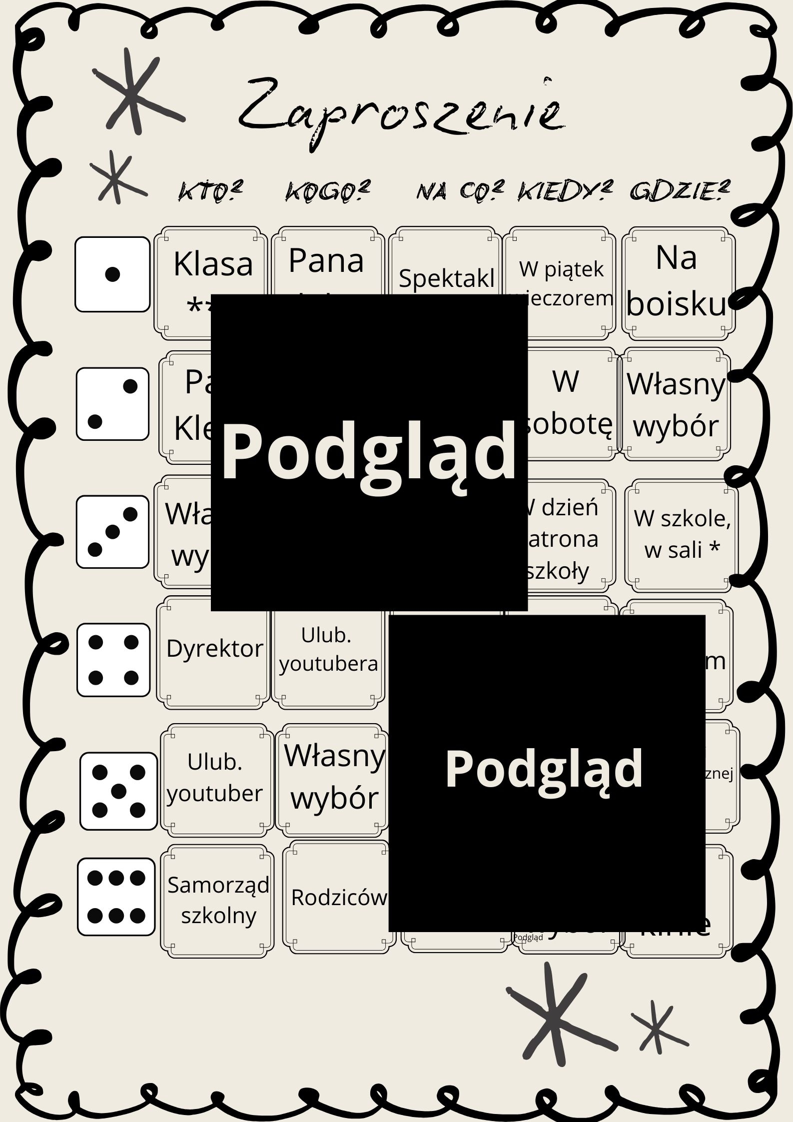 Uczniowie rzucają kostką, a ilość oczek decyduje o ostatecznym kształcie ich zaproszenia. Po wylosowaniu wszystkich elementów, przystępujemy do pisania.