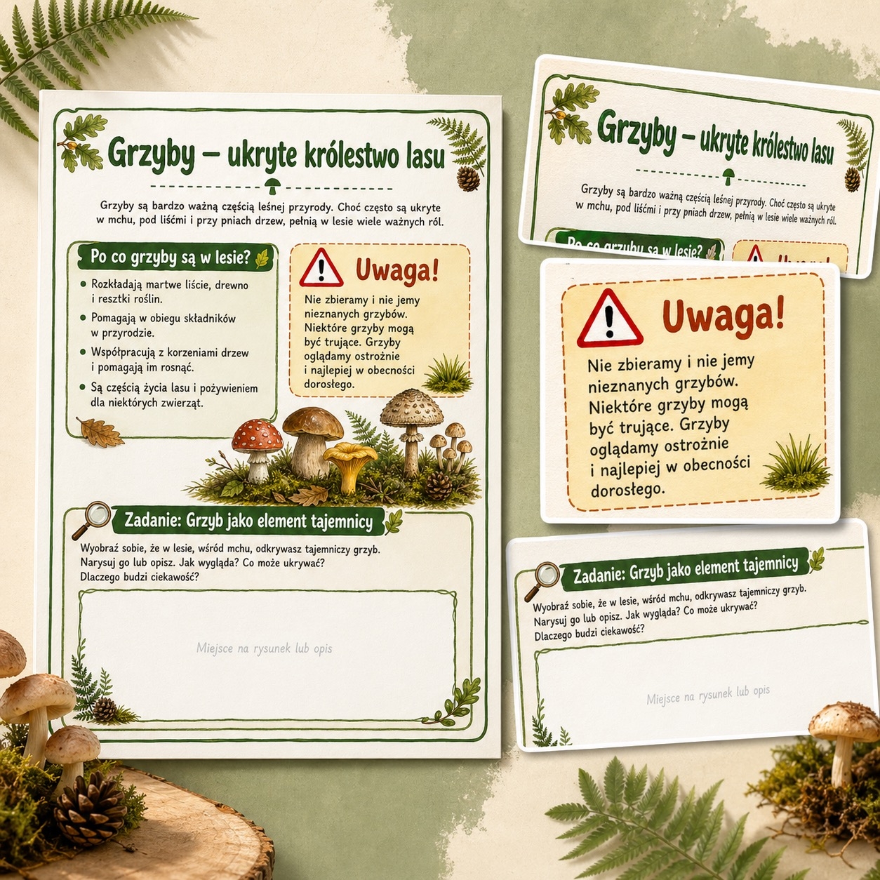 Na karcie znajduje się również ważne ostrzeżenie: nie zbieramy i nie jemy nieznanych grzybów, ponieważ niektóre z nich mogą być trujące. Dzieci uczą się więc nie tylko o przyrodzie, ale także o bezpiecznym zachowaniu podczas spacerów po lesie. ⚠️🍄